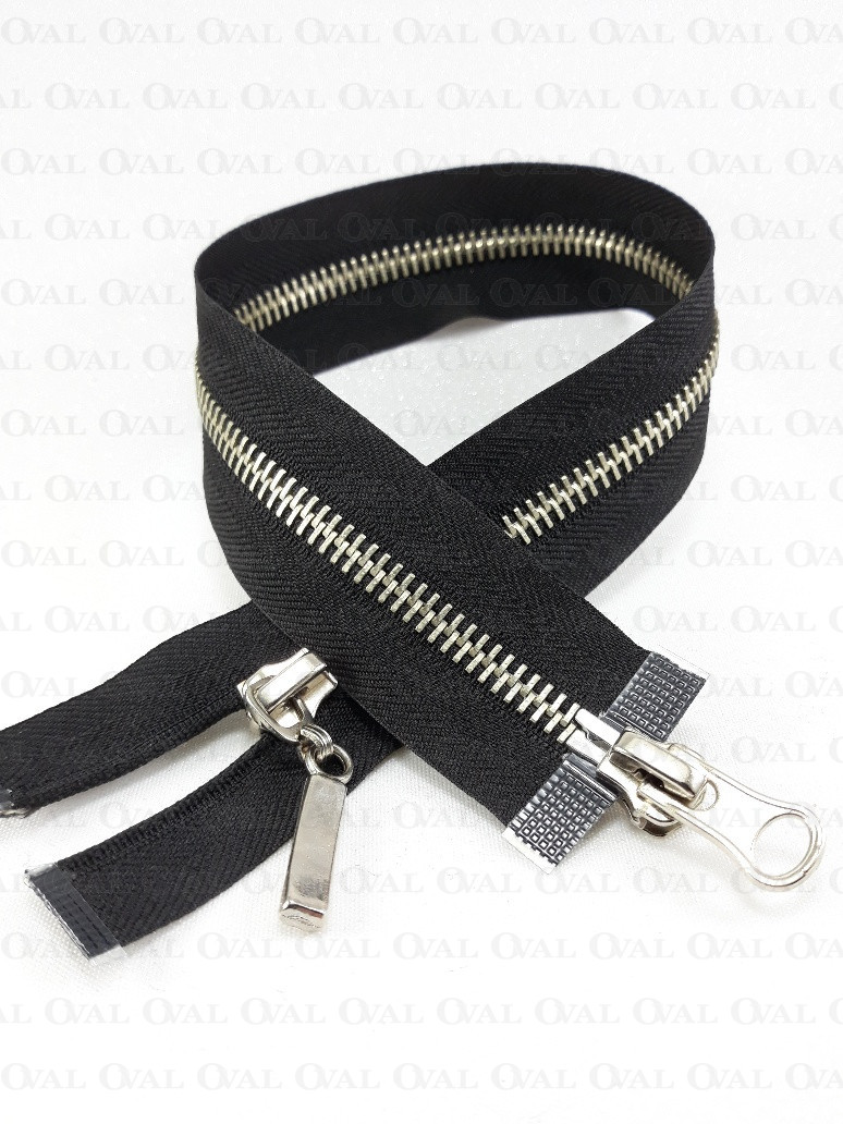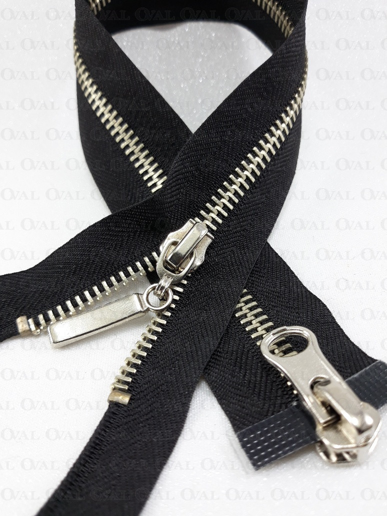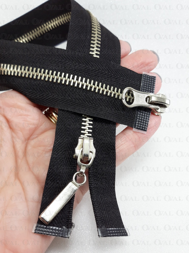 Rozdzielczy zamek góra/dół z matowymi, metalowymi ząbkami w kolorze srebrno złotym ze srebrną końcówką.