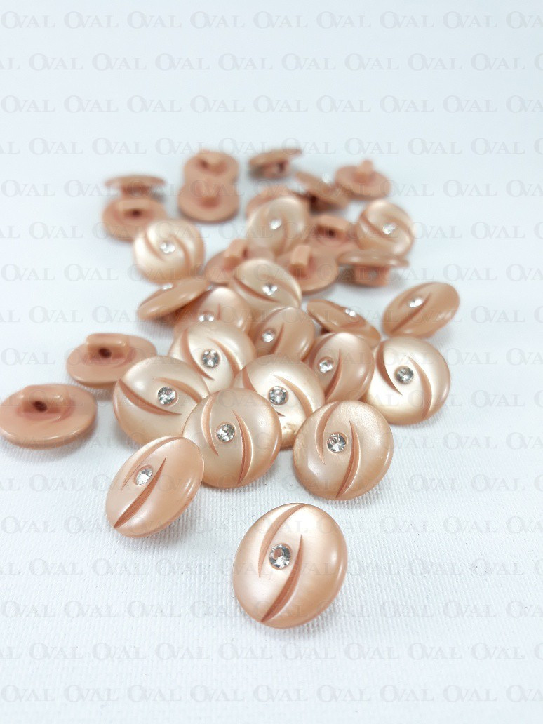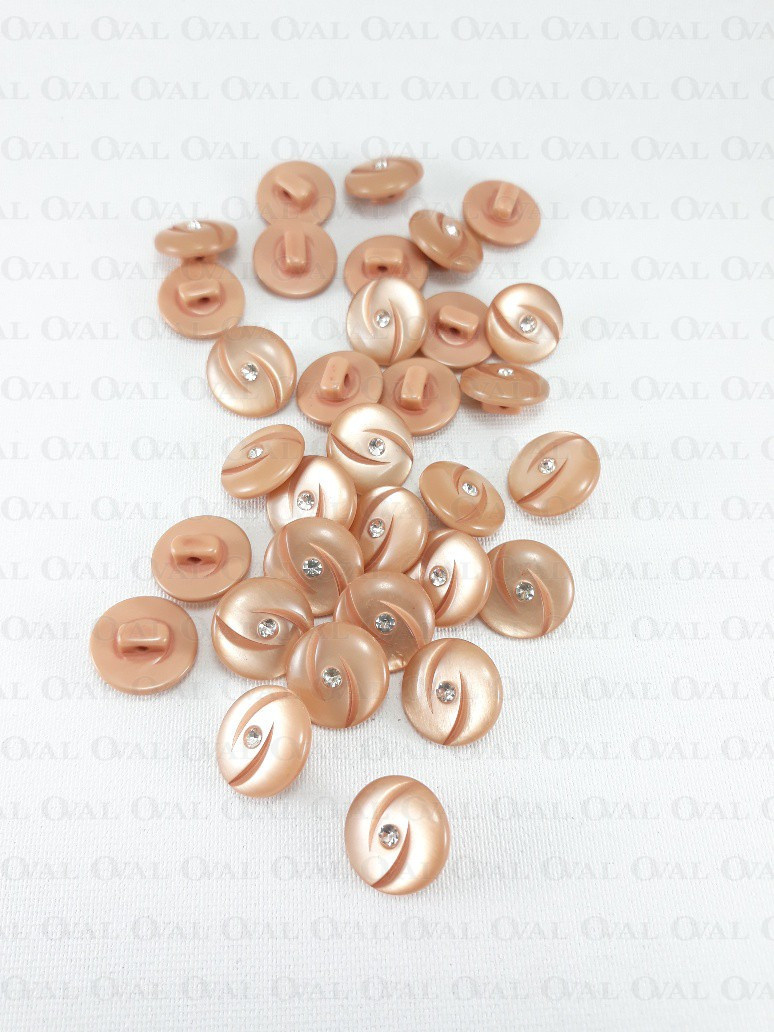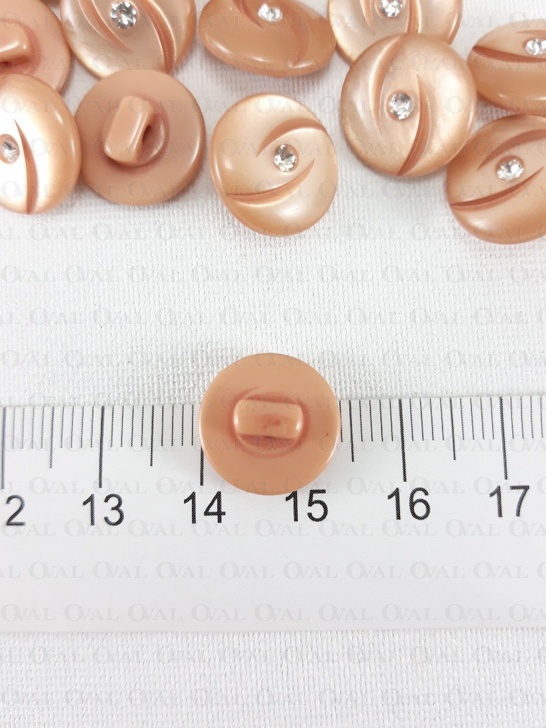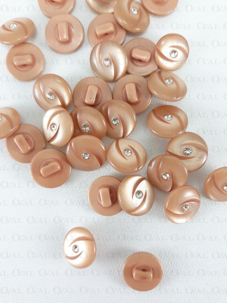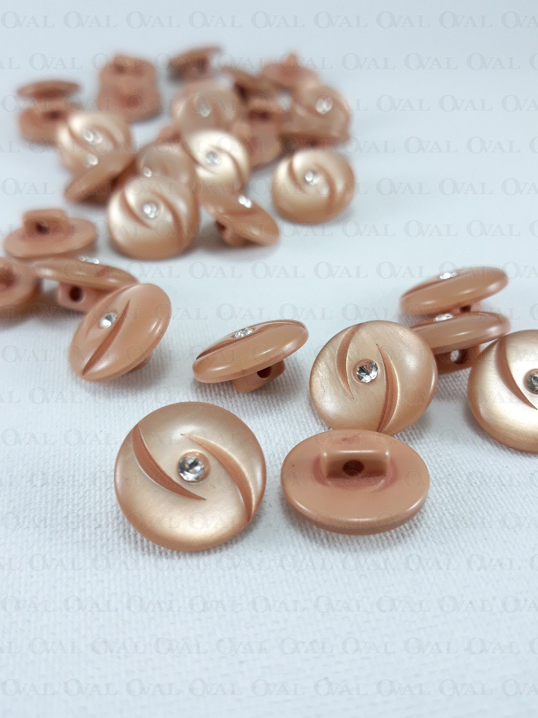 Plastic button made of mother-of-pearl with a rhinestone, additionally it has two decorative cuts.