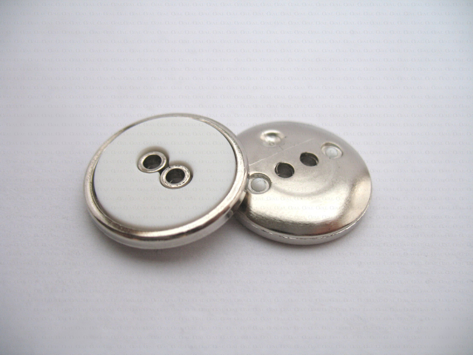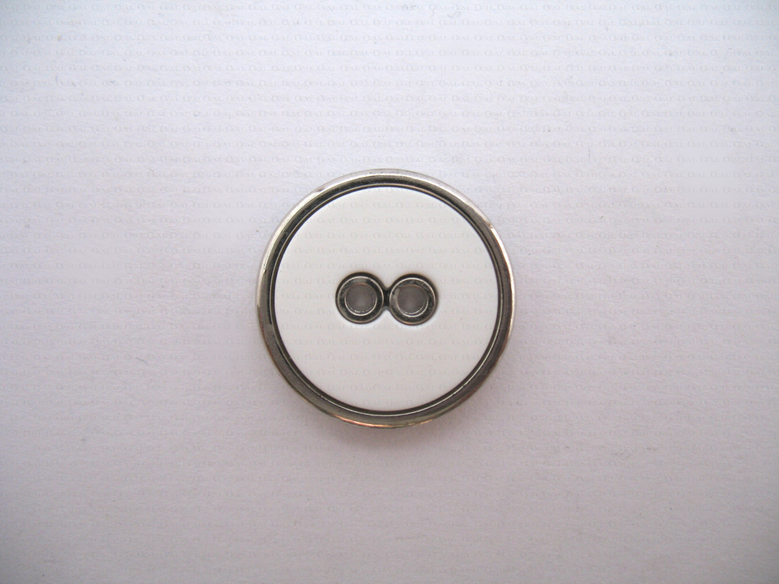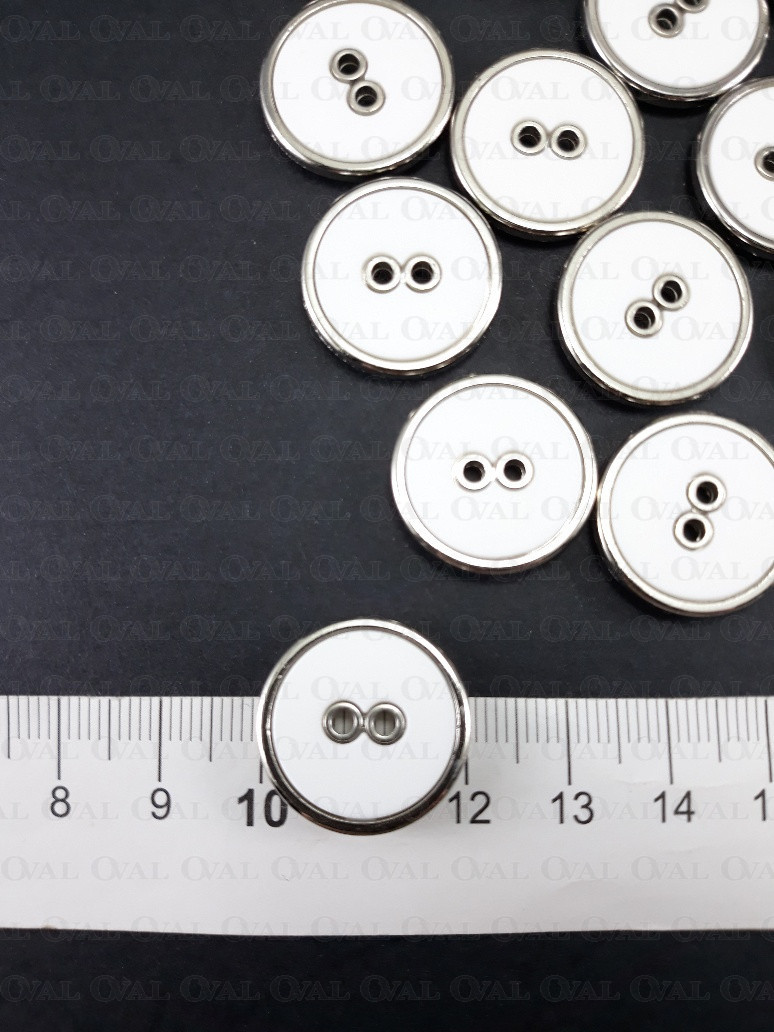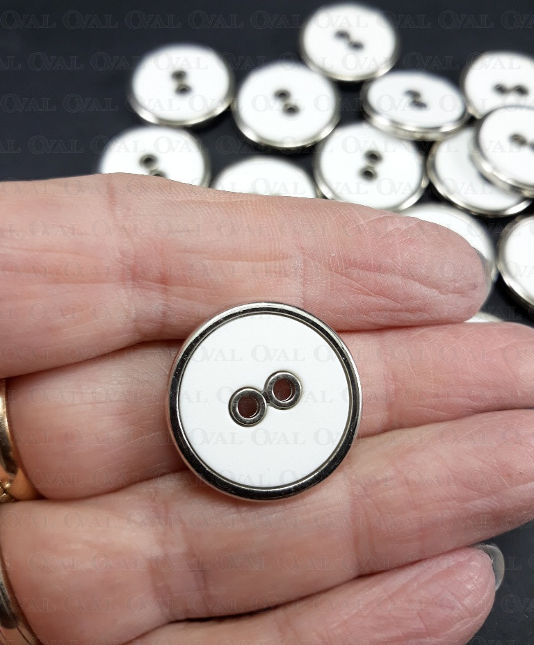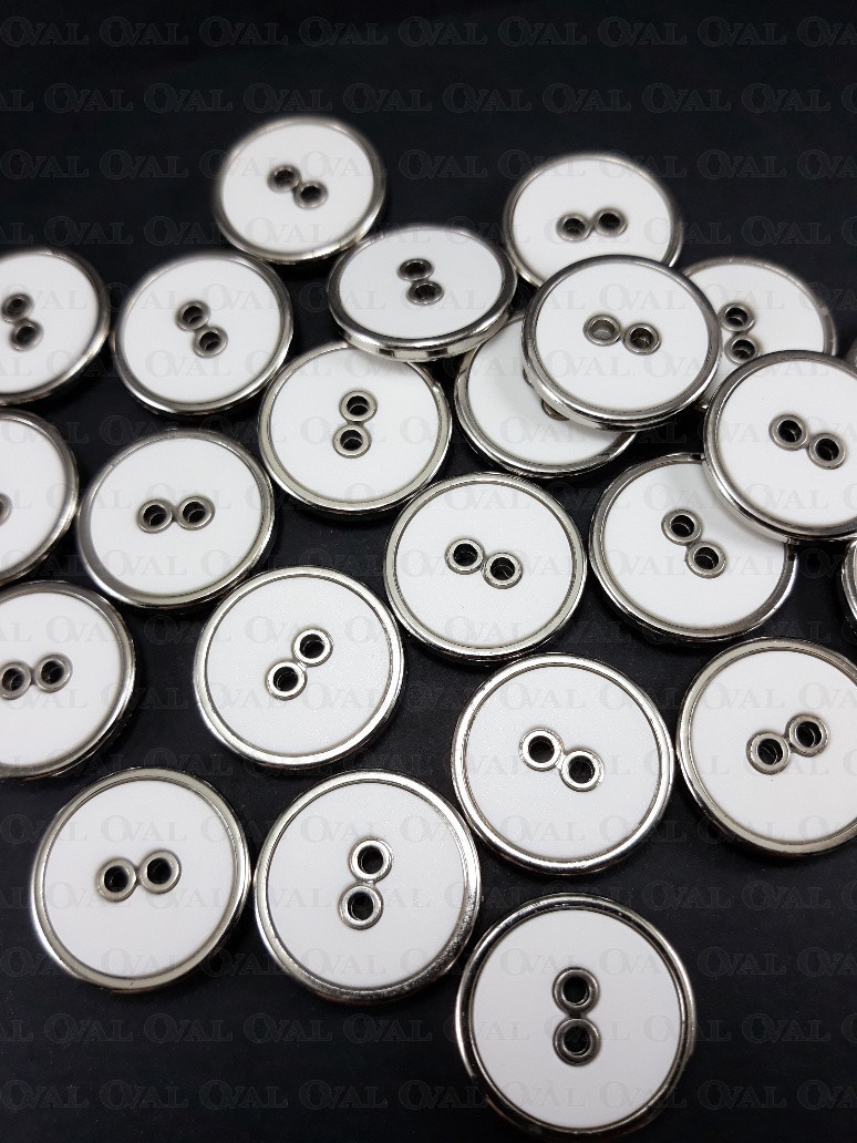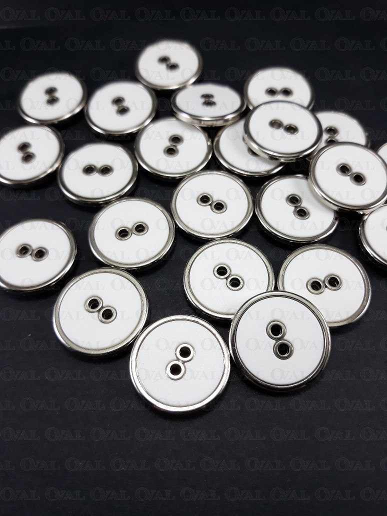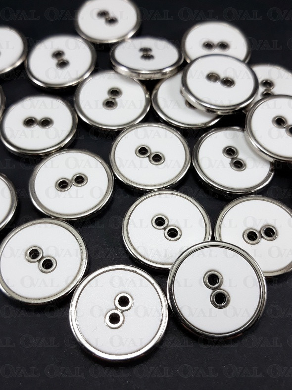 Plastic button, white centre with a silver rim