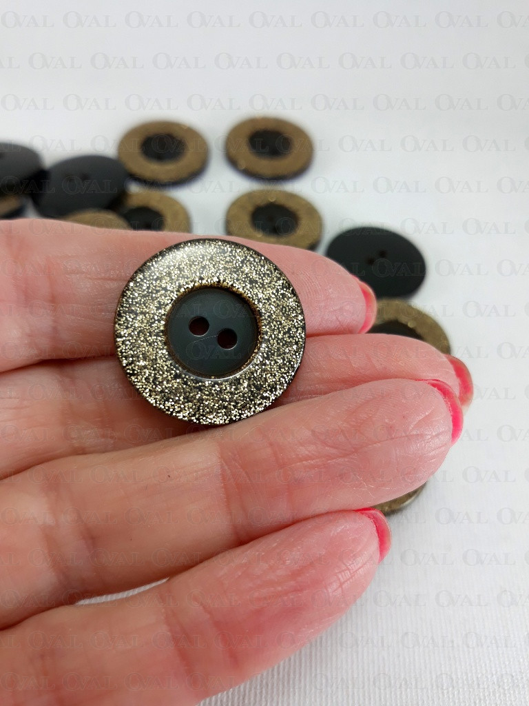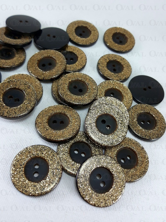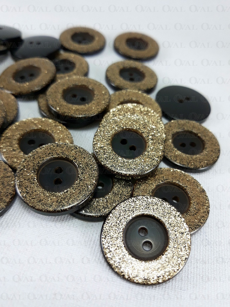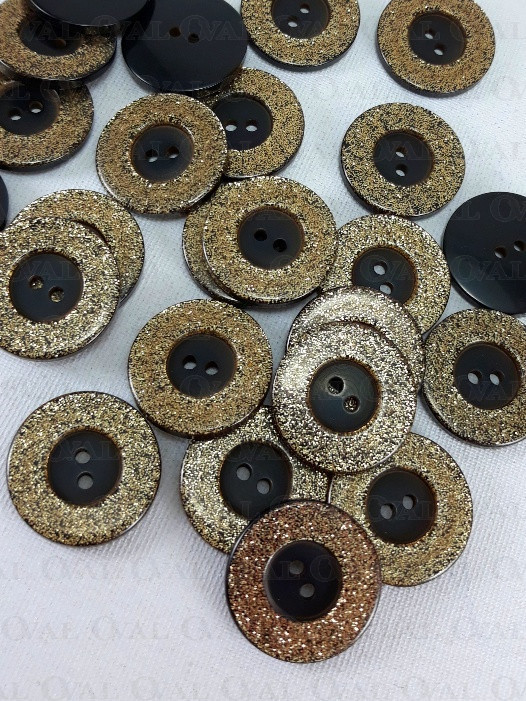 Polyester button with gold glitter.