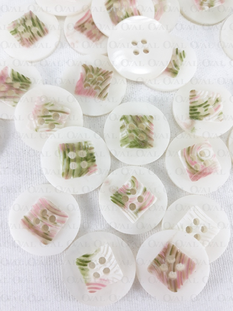 Four-hole polyester button, pearly with an engraved square-shaped decoration in