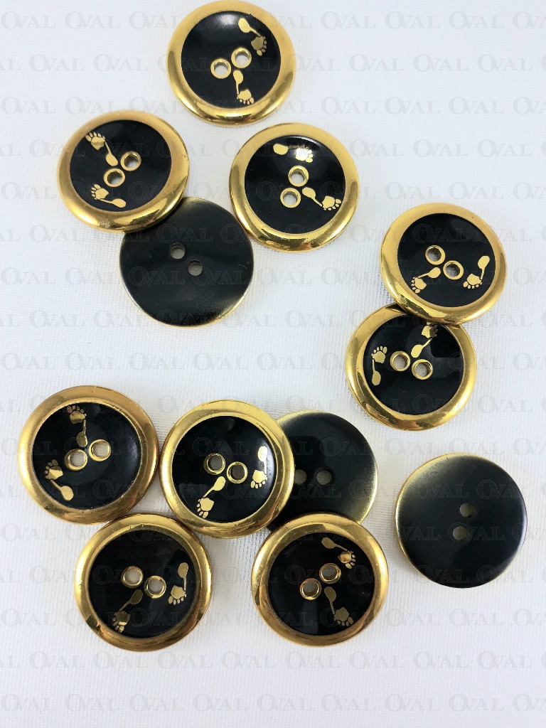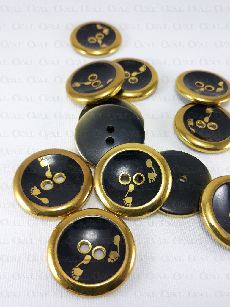 Plastic button with a gold rim and a footprint print