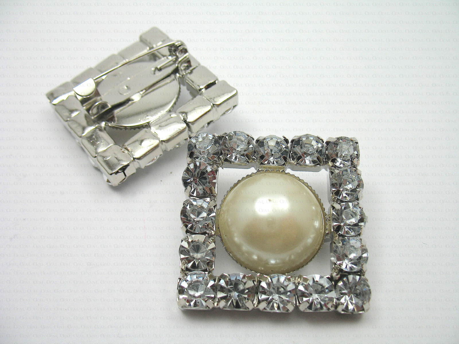 Decorative metal brooch with acrylic stones and an imitation pearl in a square shape.