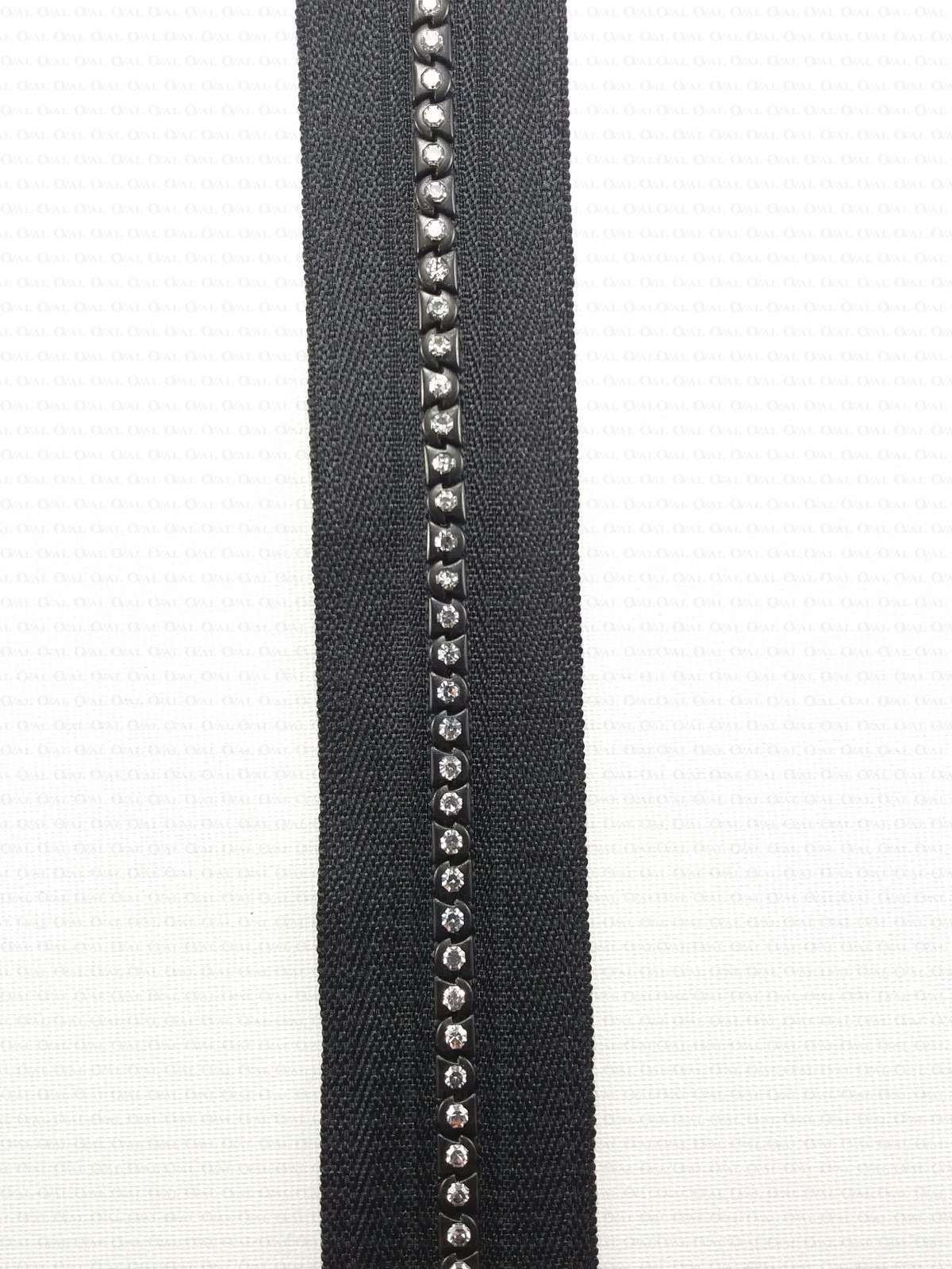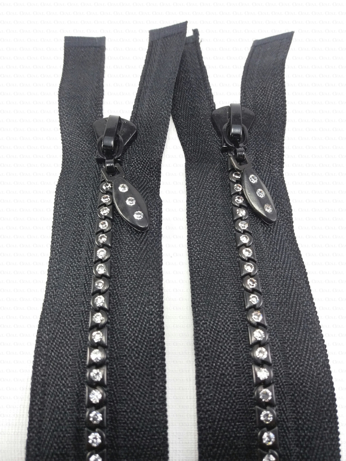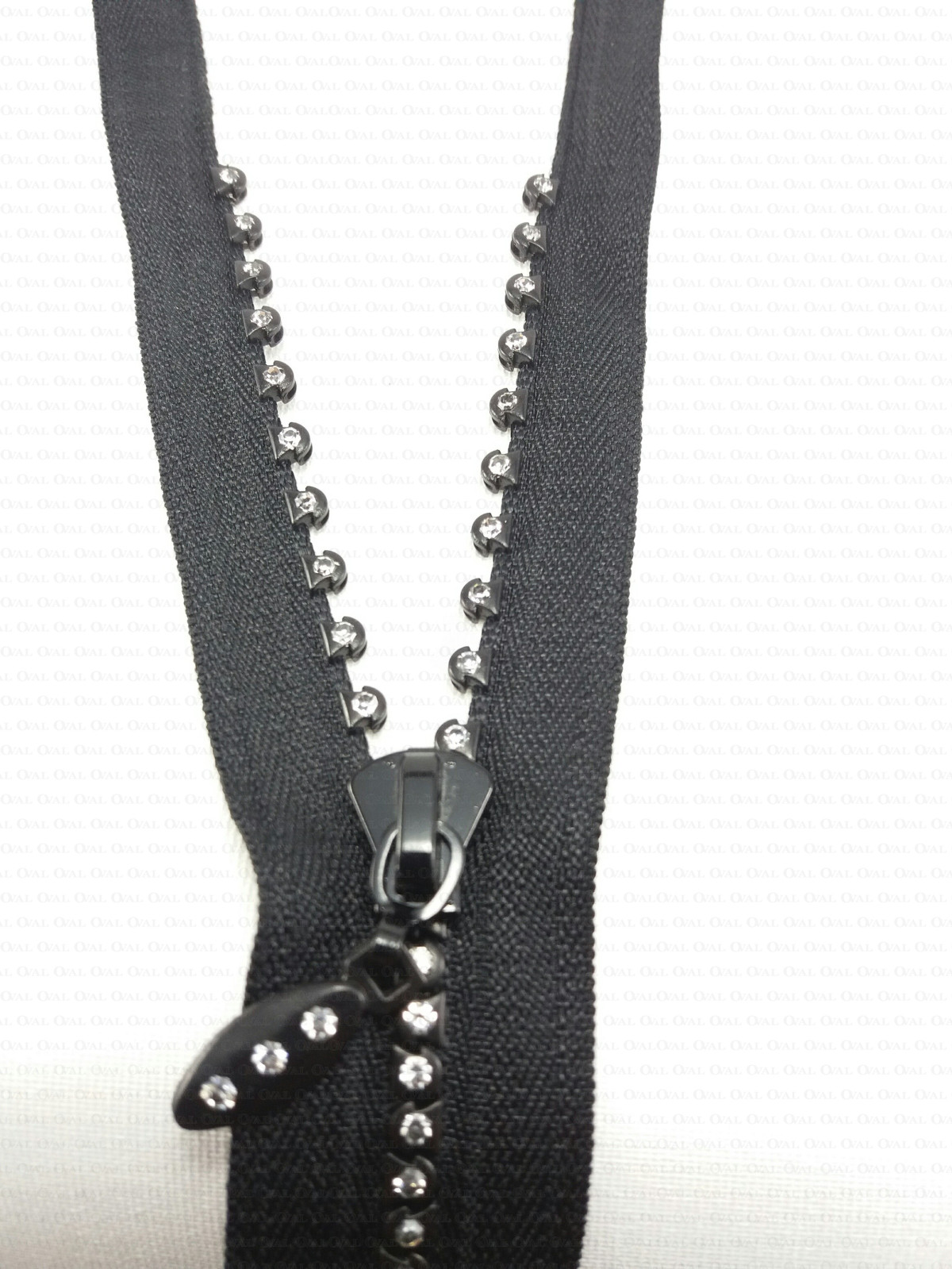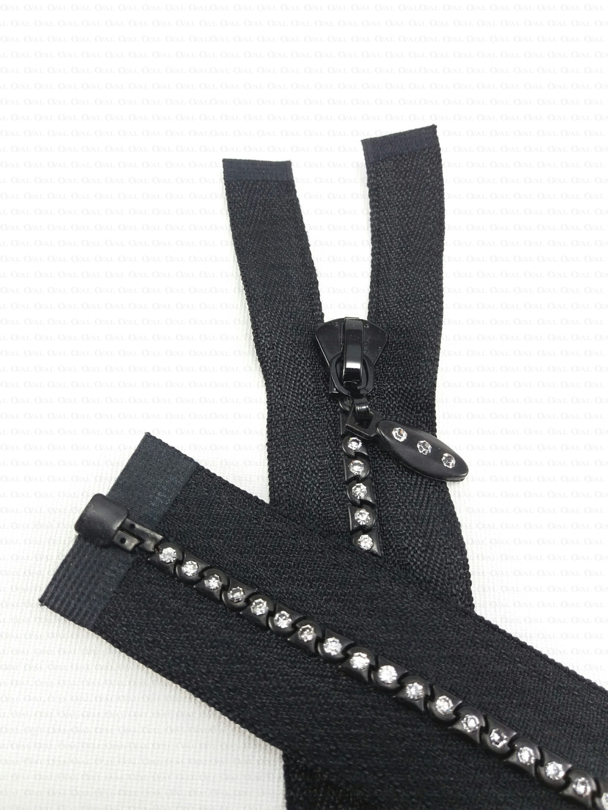 Decorative separating zip with rhinestones. Each plastic tooth has an embedded rhinestone, additionally there are three rhinestones in the end piece. Available in two lengths: 50 cm and 55 cm