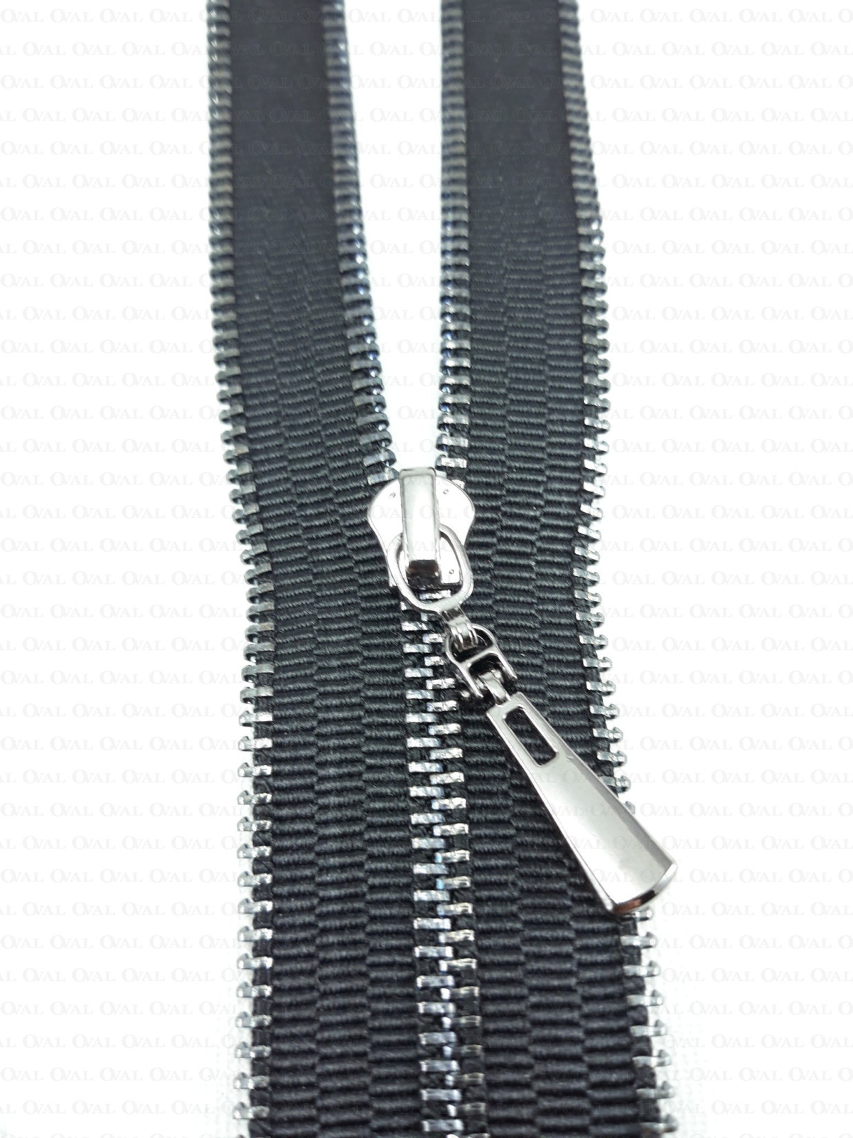 Non-separable metal zip with decorative teeth along the edge of the tape.