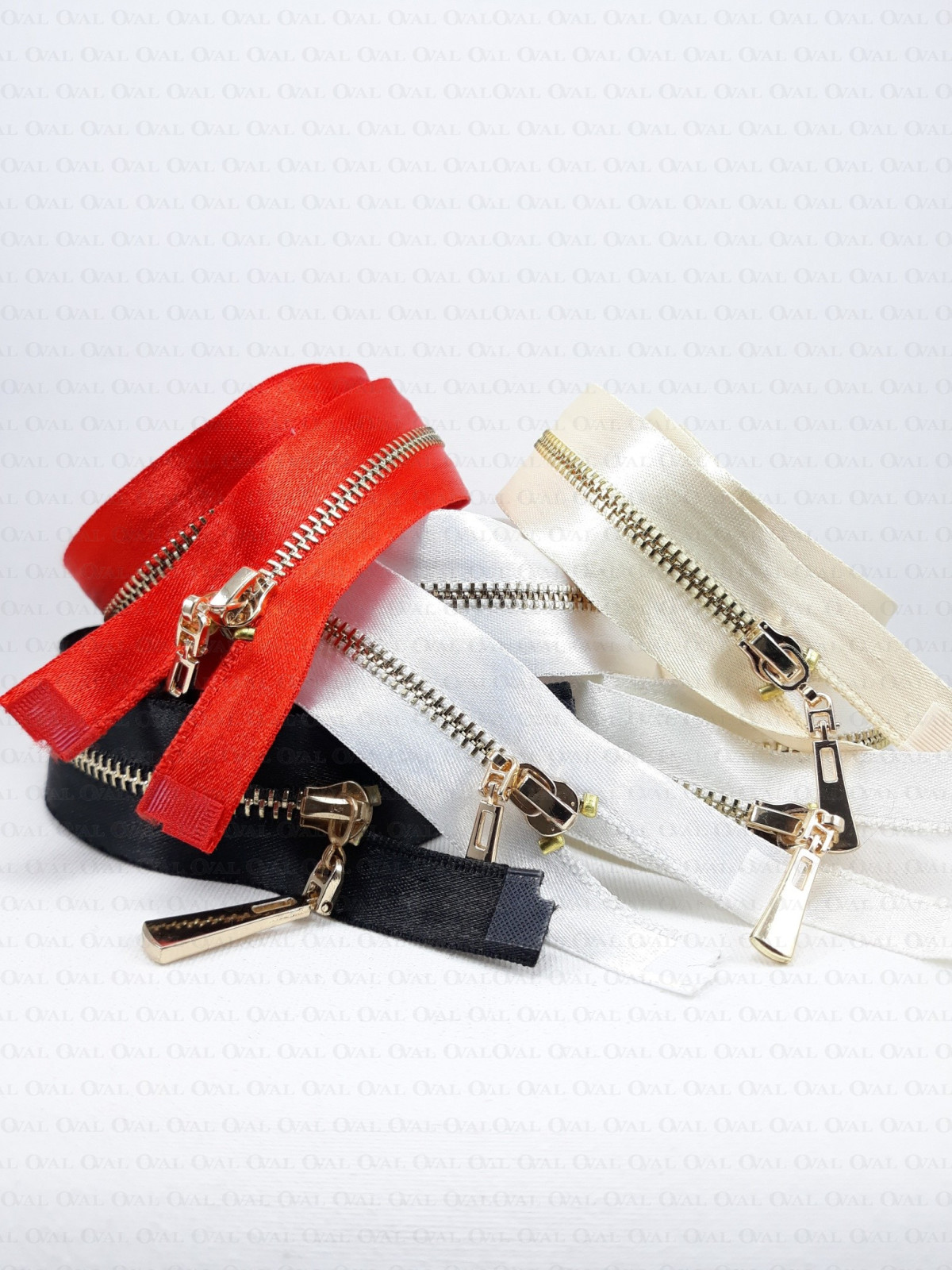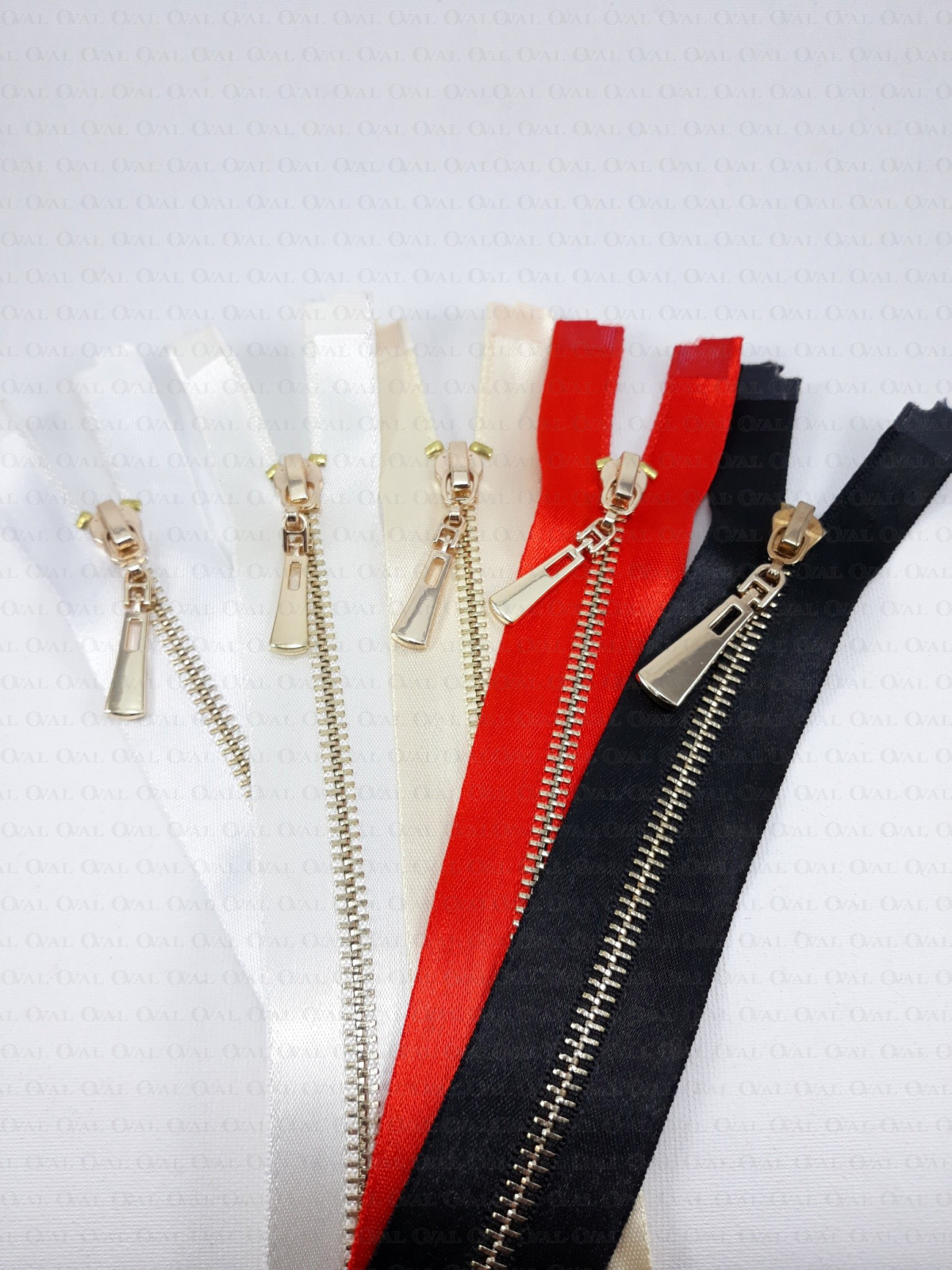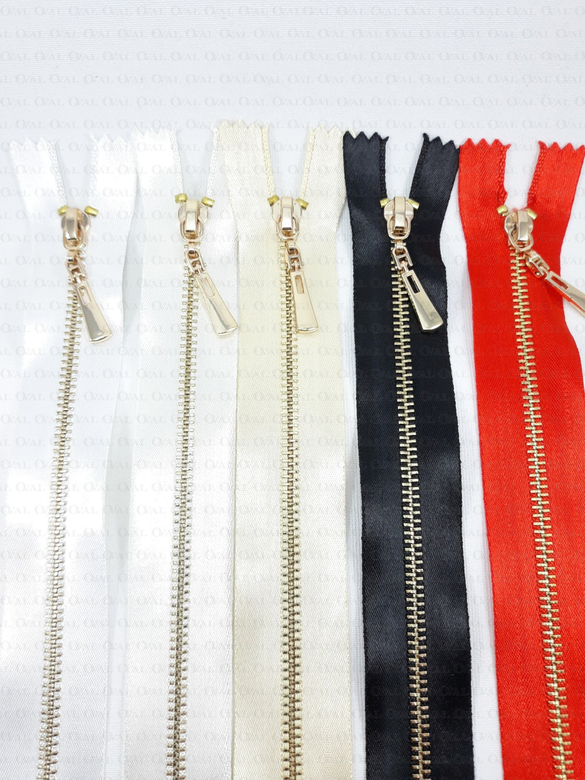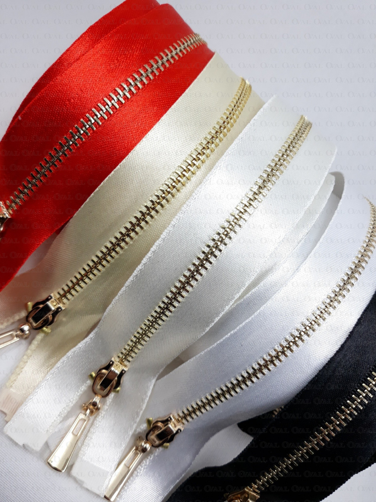 Metal separating zips on satin tape with gold teeth