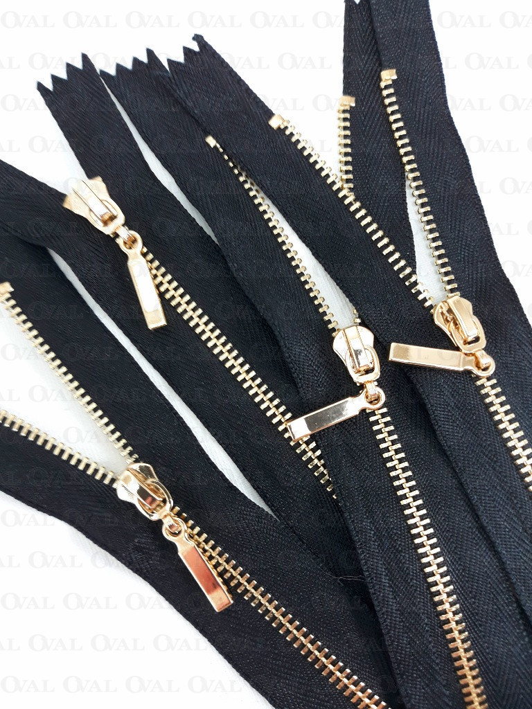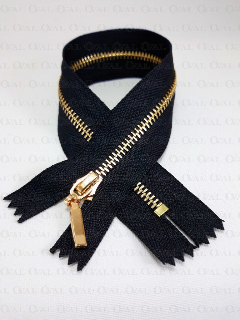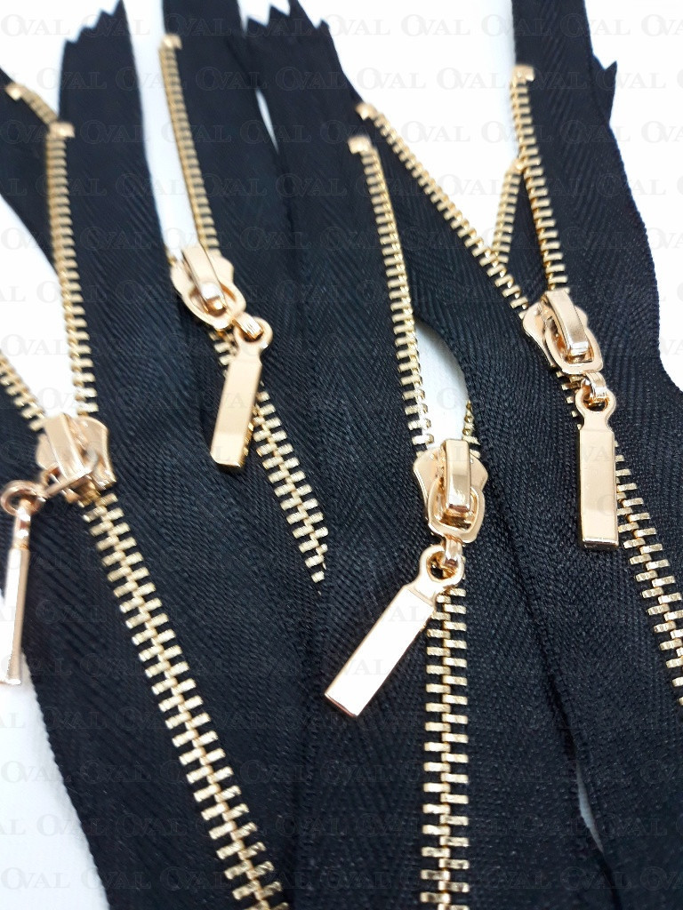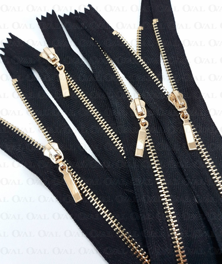 Non-separable metal zips, black tape with gold teeth