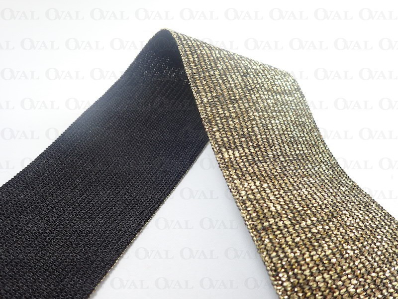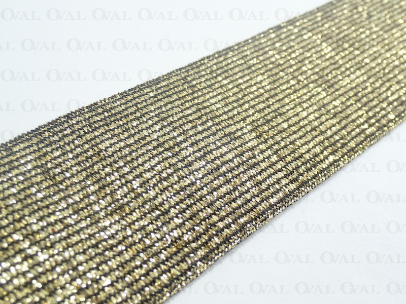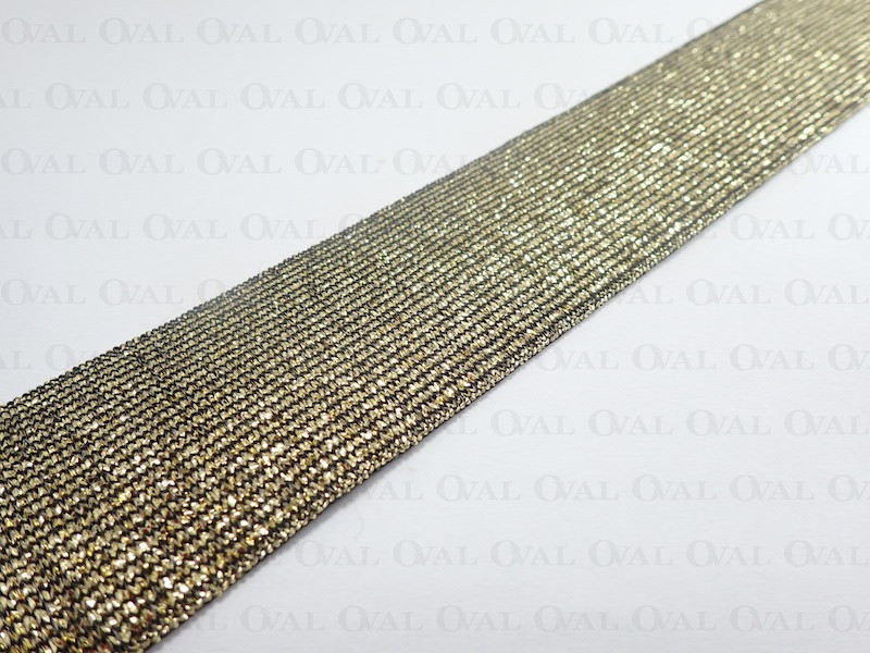 Decorative elastic with a golden thread, available by the metre or in 25‑metre rolls,