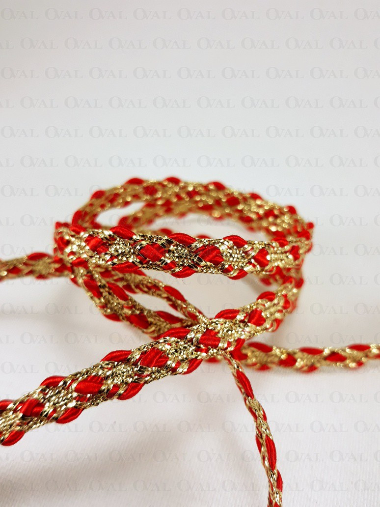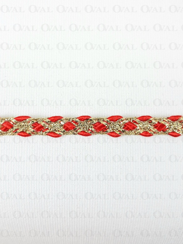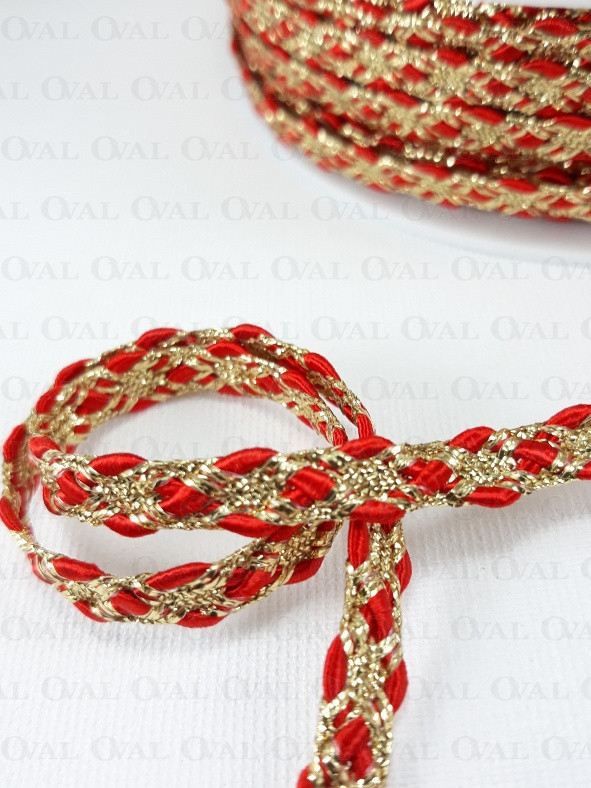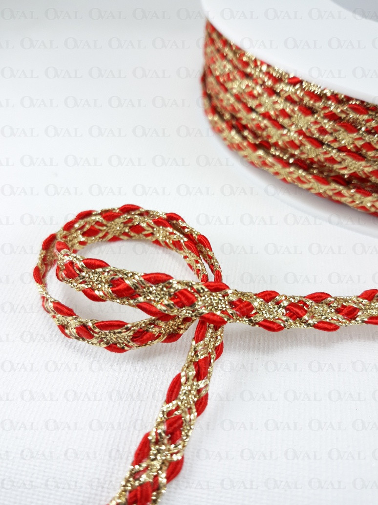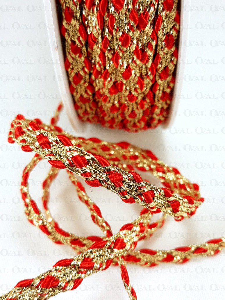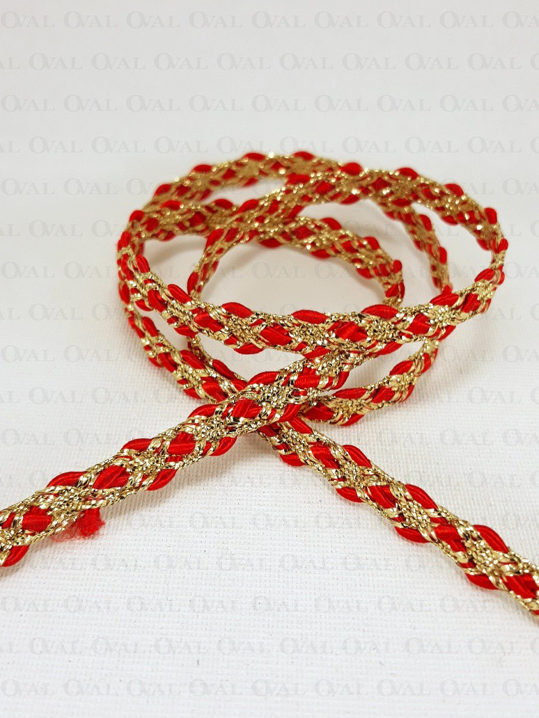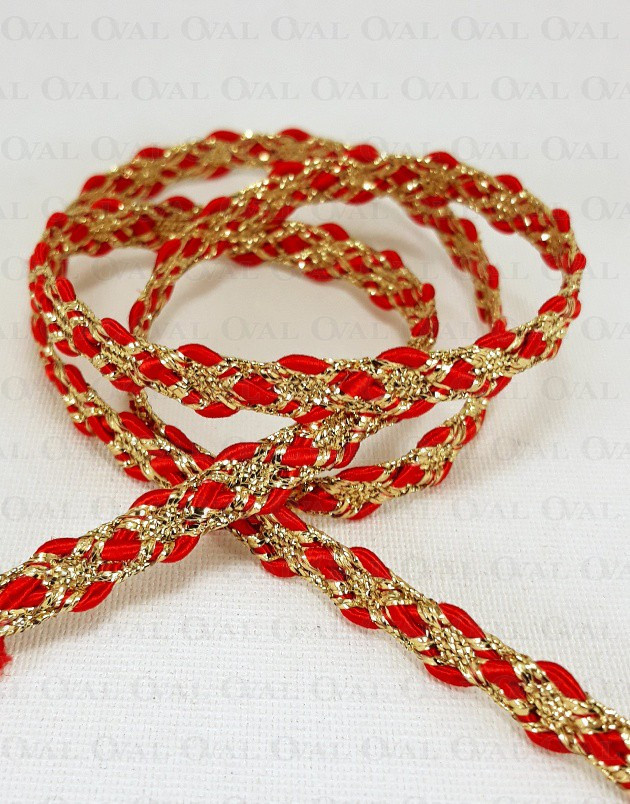 Decorative tape, golden lurex with a red satin cord.