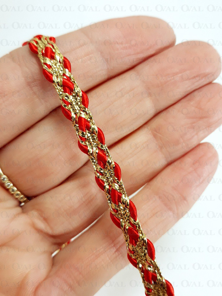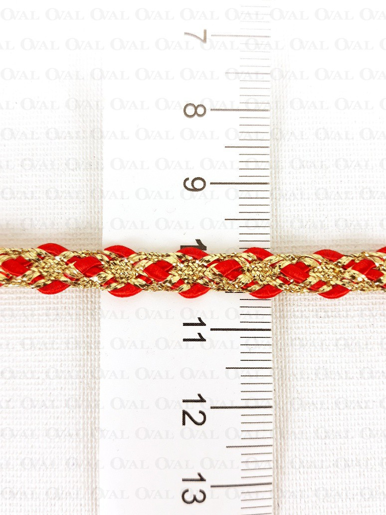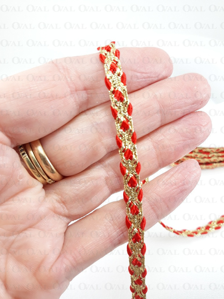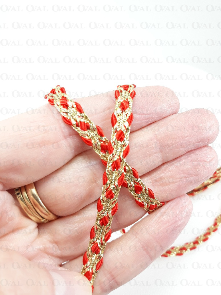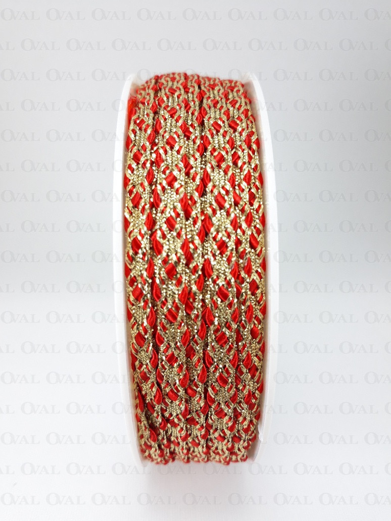 Decorative tape, golden lurex with a red satin cord.