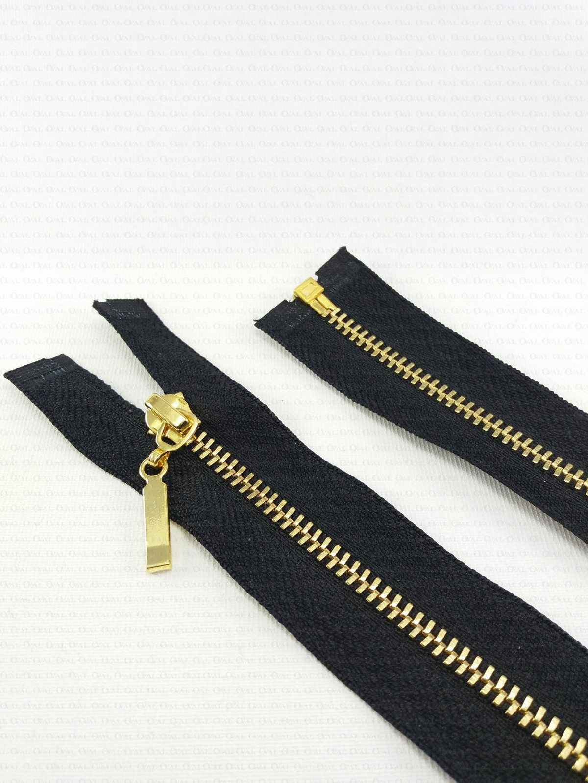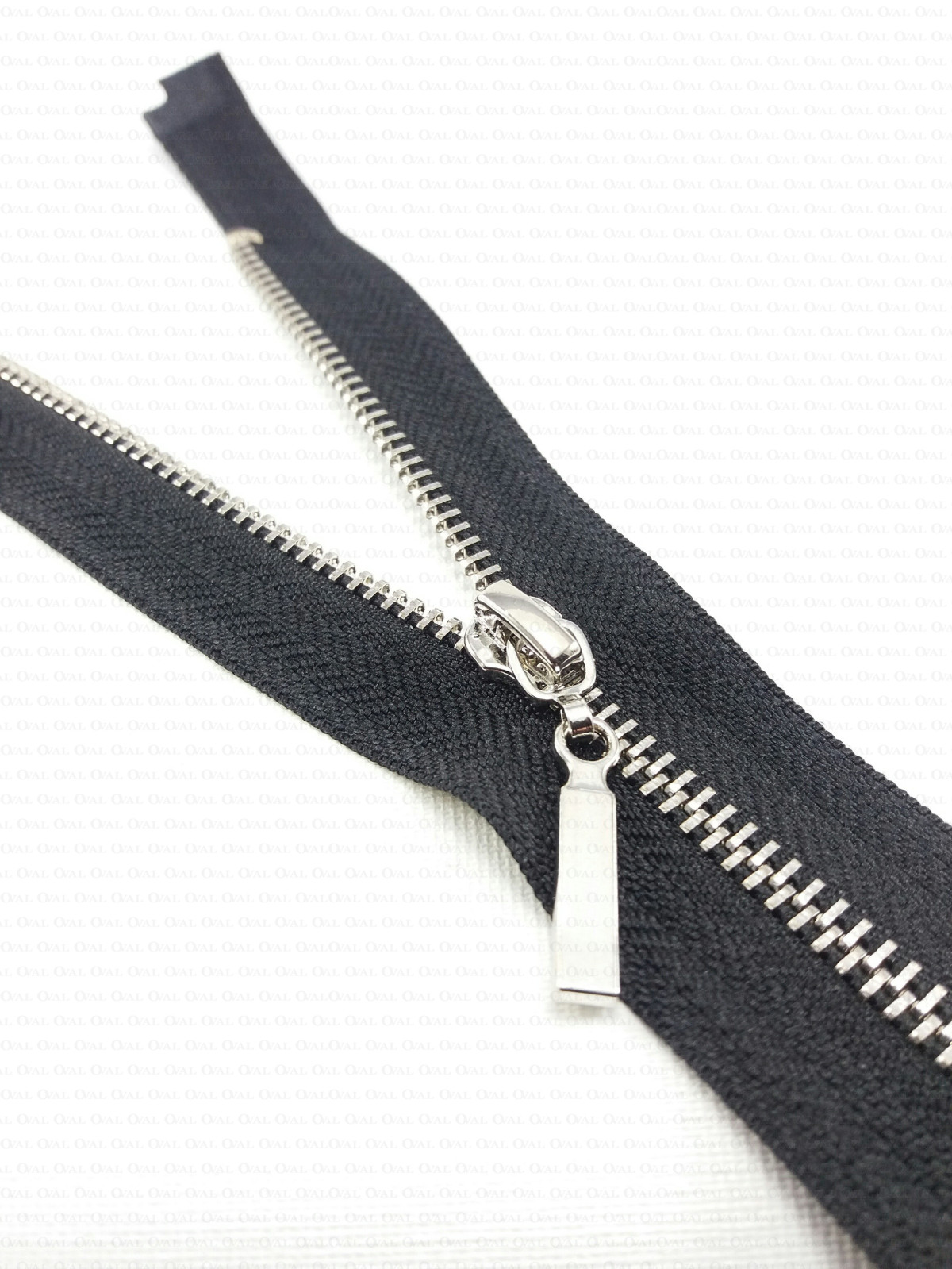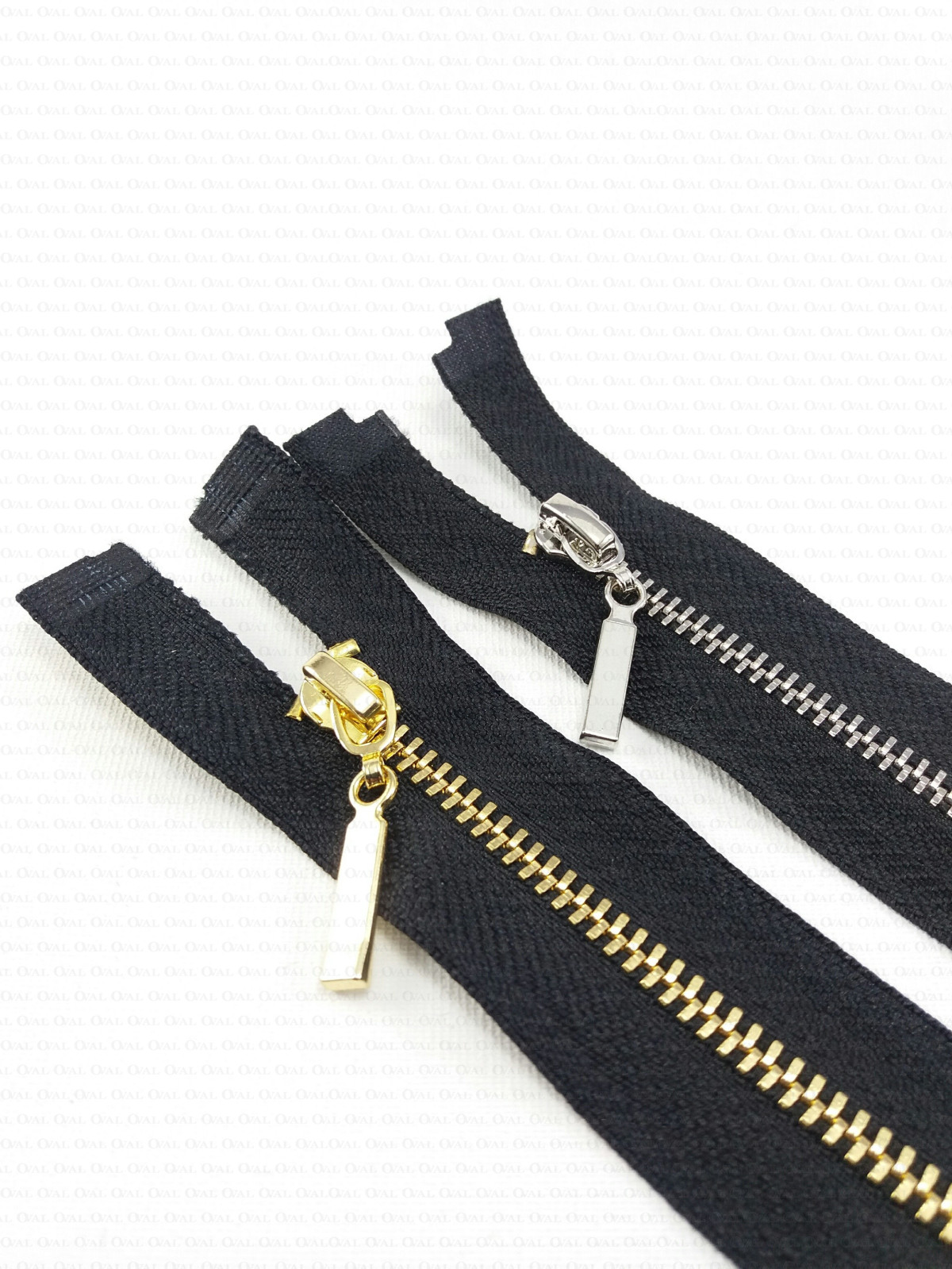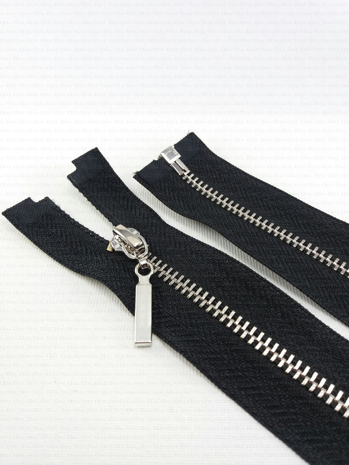 Metal separating zips on black tape with a decorative end, available in several lengths.