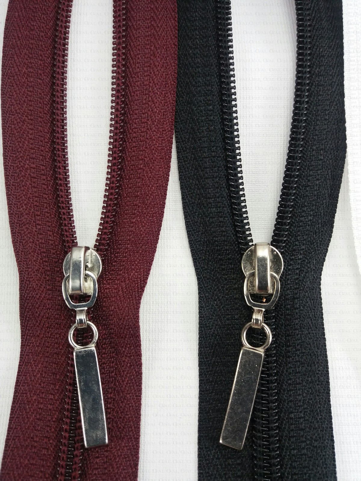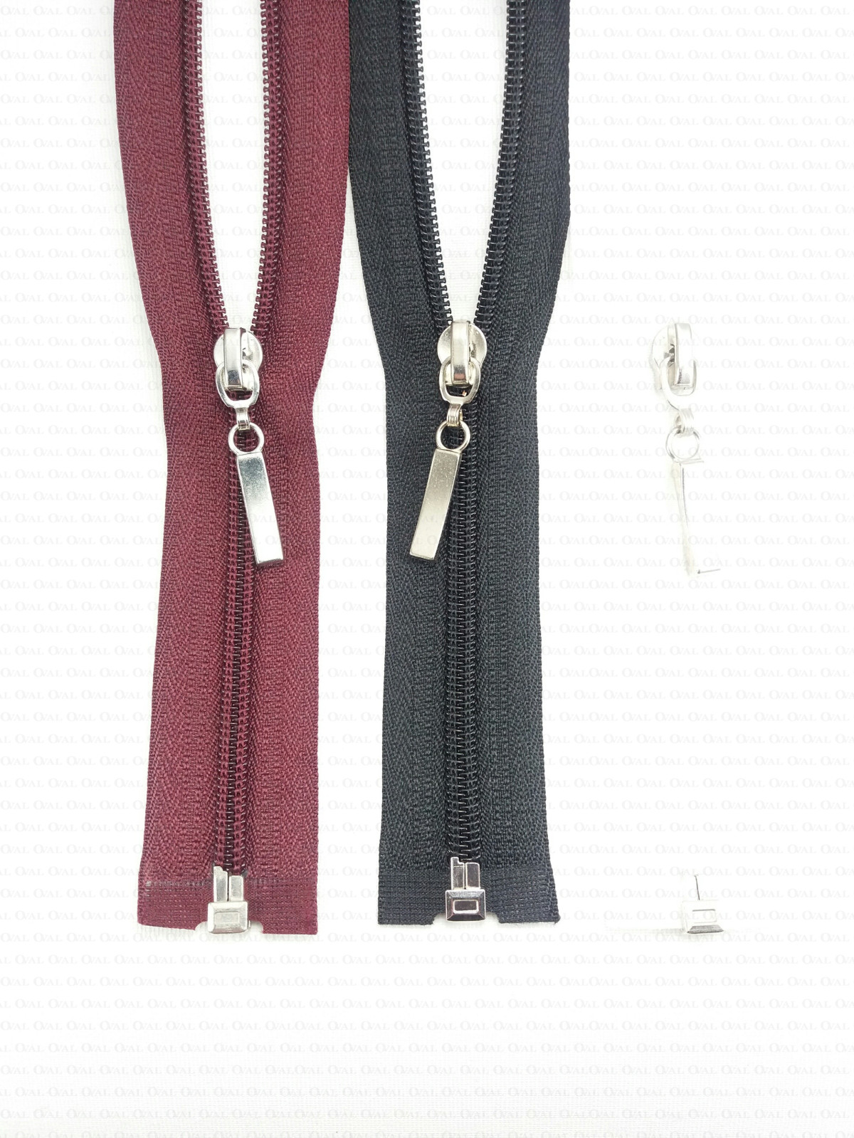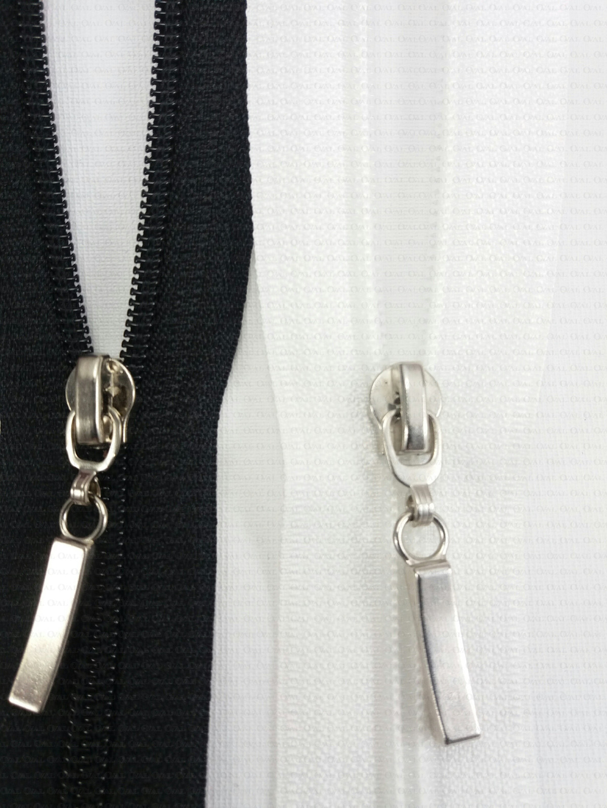 Separating zips, plastic with a metal end.