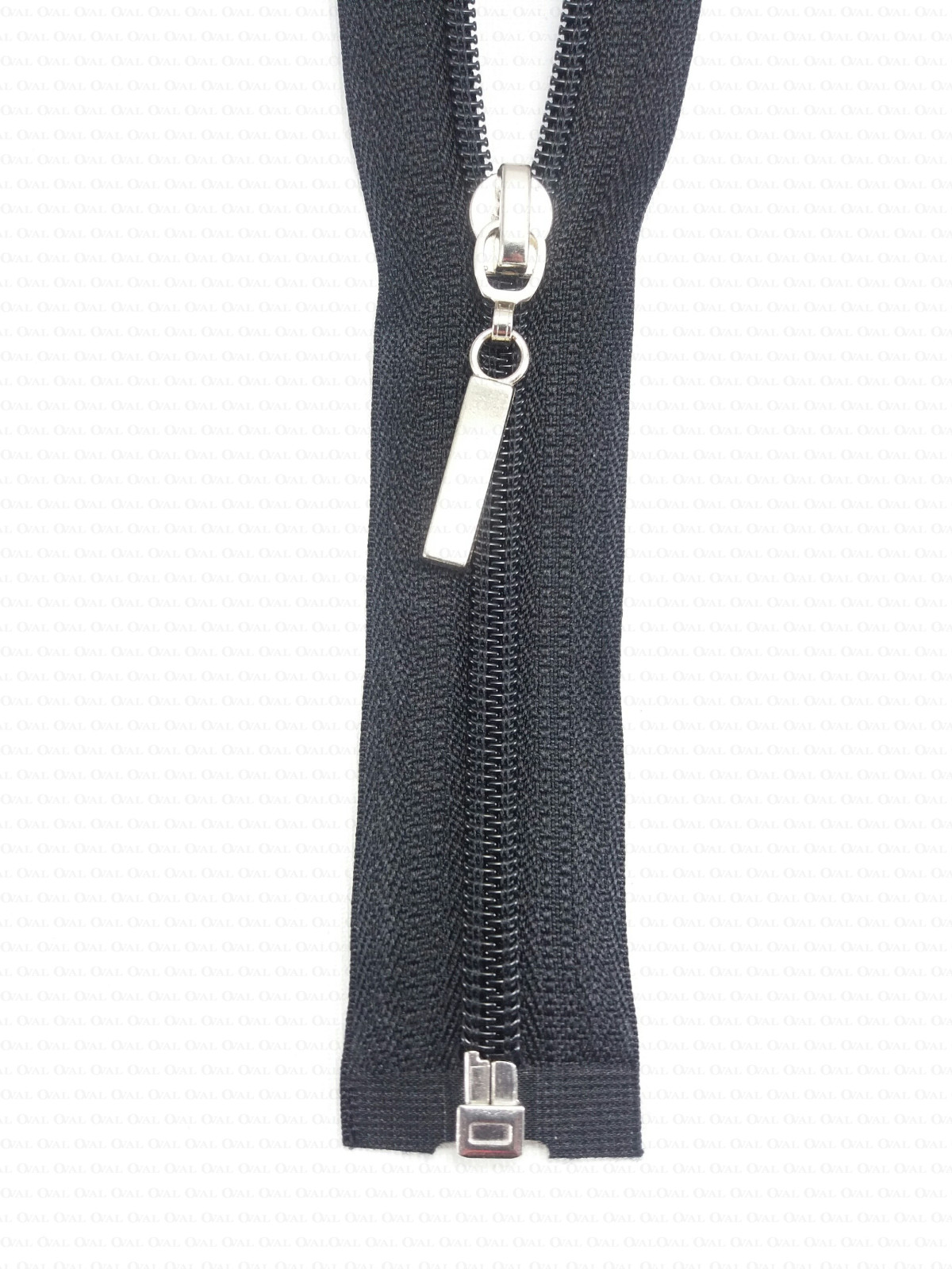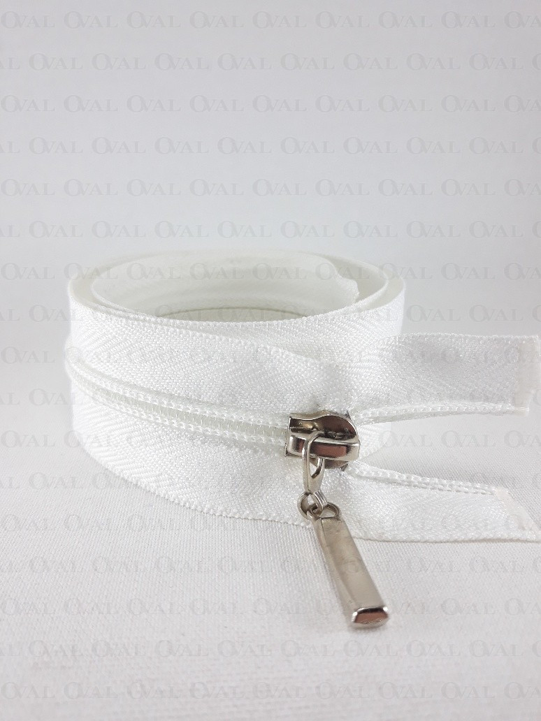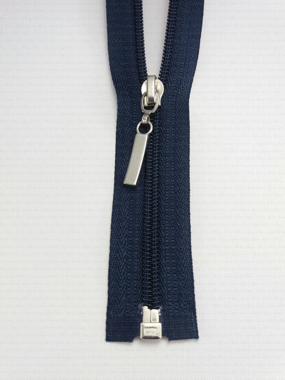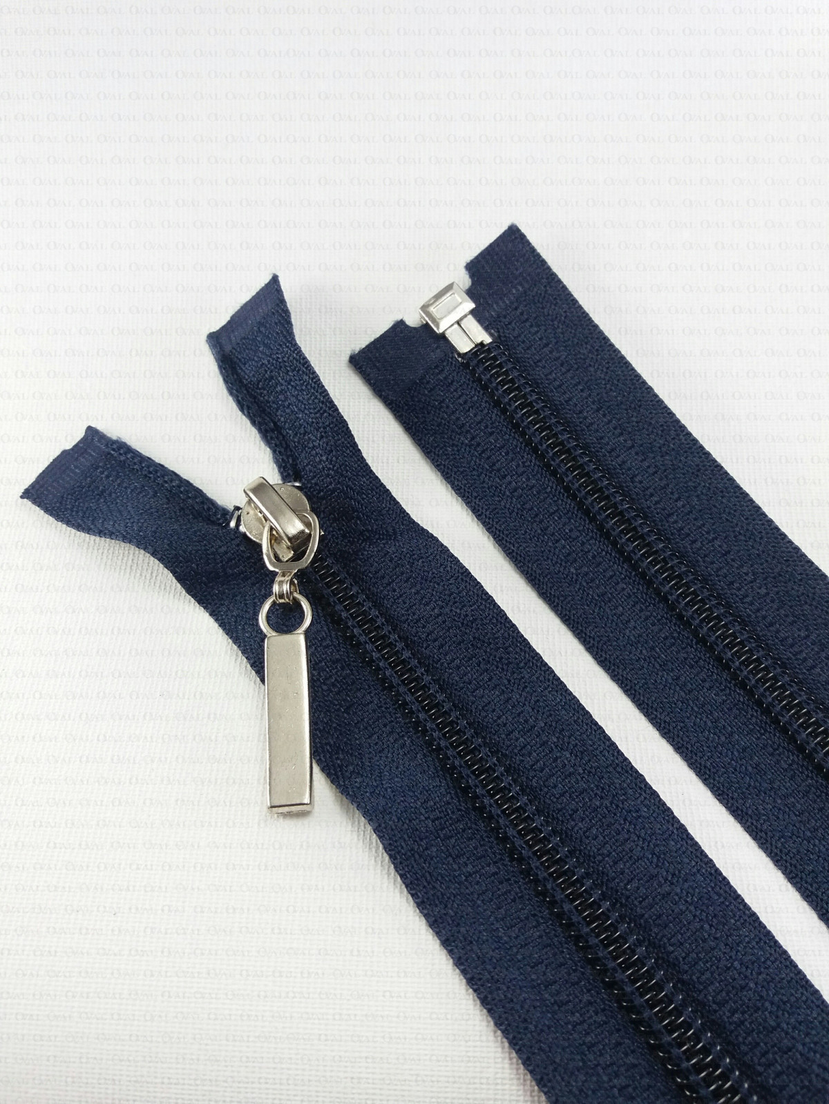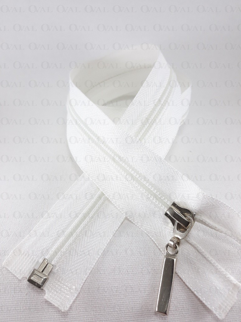 Separating zips, plastic with a metal end. Colours: black, navy blue and white