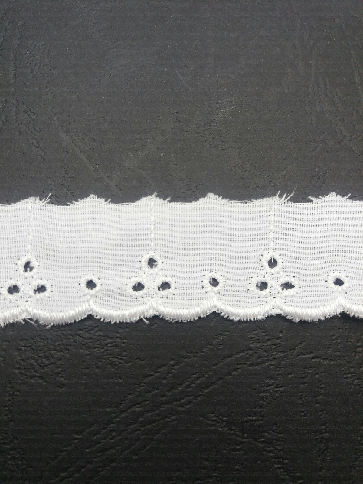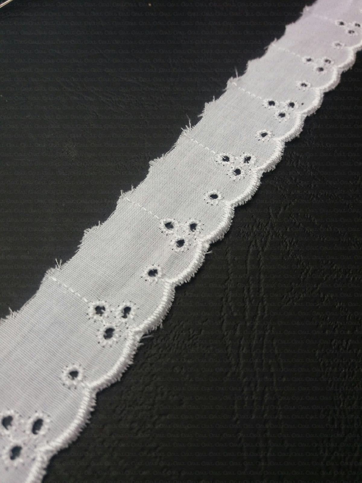 Sewing shop Oval offers English embroidery in white, made from a white, natural, breathable fabric. It was machine‑made. We sell lace by the metre in running length. The price given below is the price for 1 running metre. The width of the lace allows it to be used in many ways. Our range includes a product with a width of 27 mm.