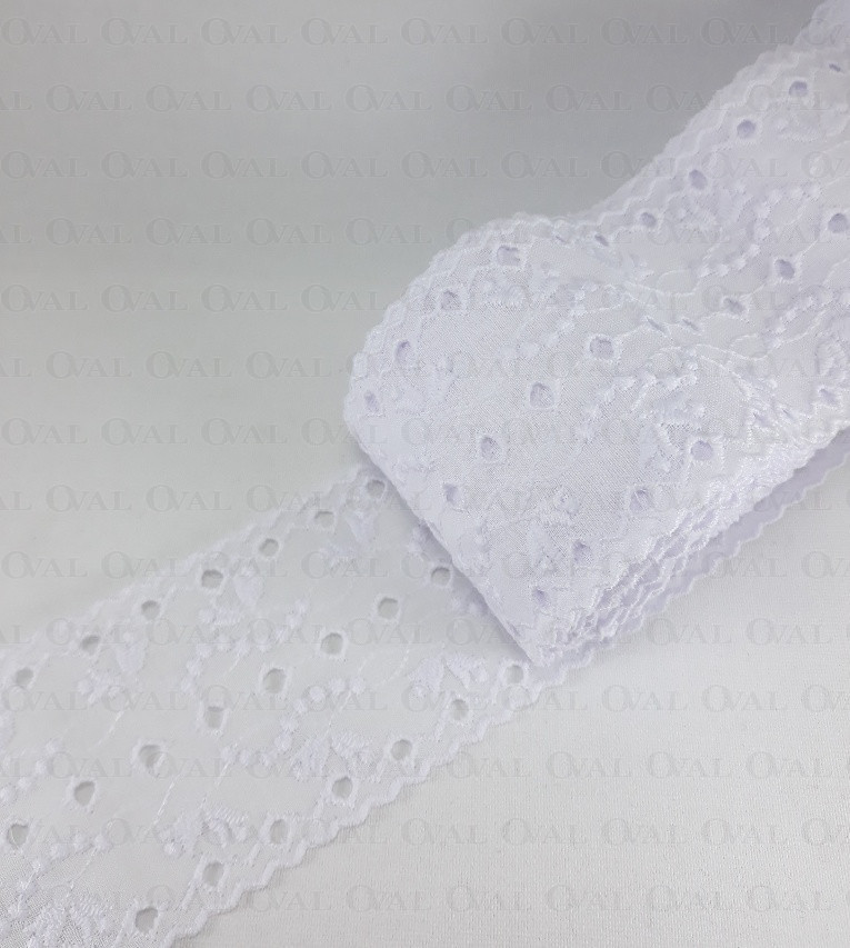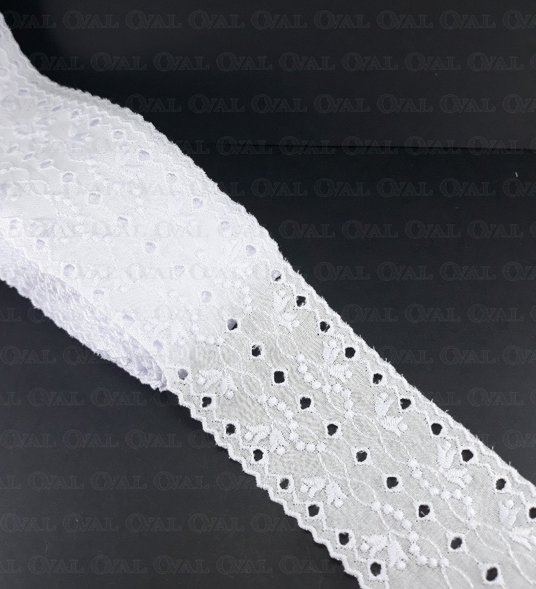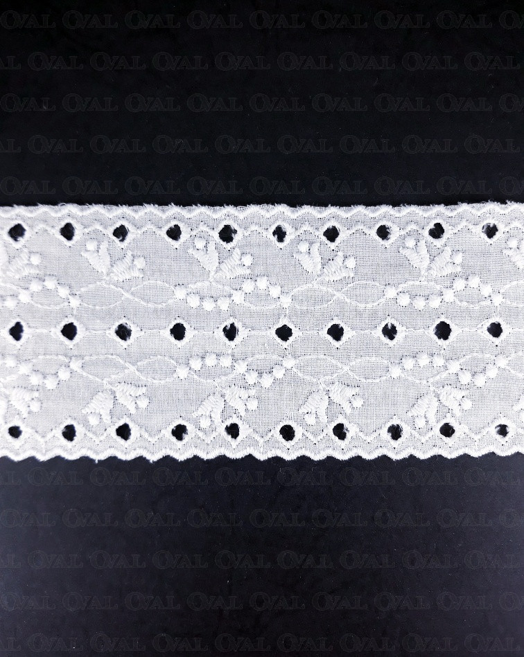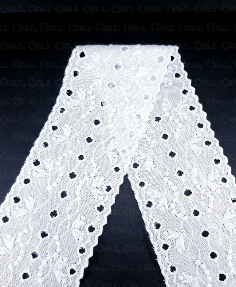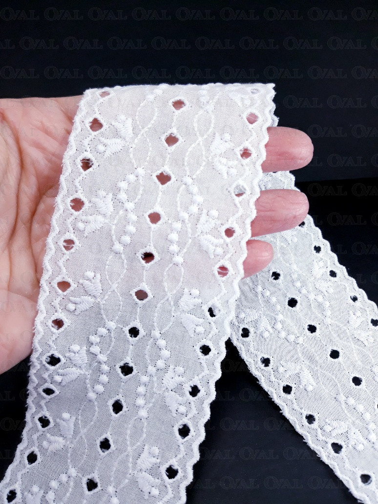 Sewing shop Oval offers English embroidery in white, made of a white, natural, breathable fabric. It was machine-made. We sell lace by the metre of length. The price shown below is the price for 1 running metre. The width of the lace allows it to be used in many ways. In our range there is a product that is 27 mm wide.