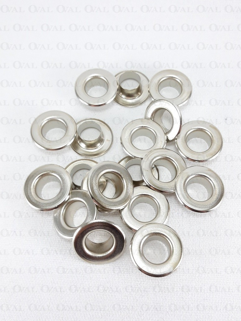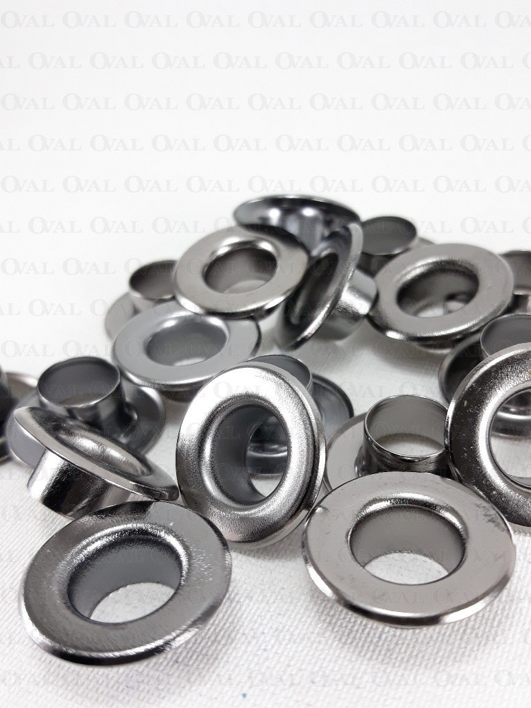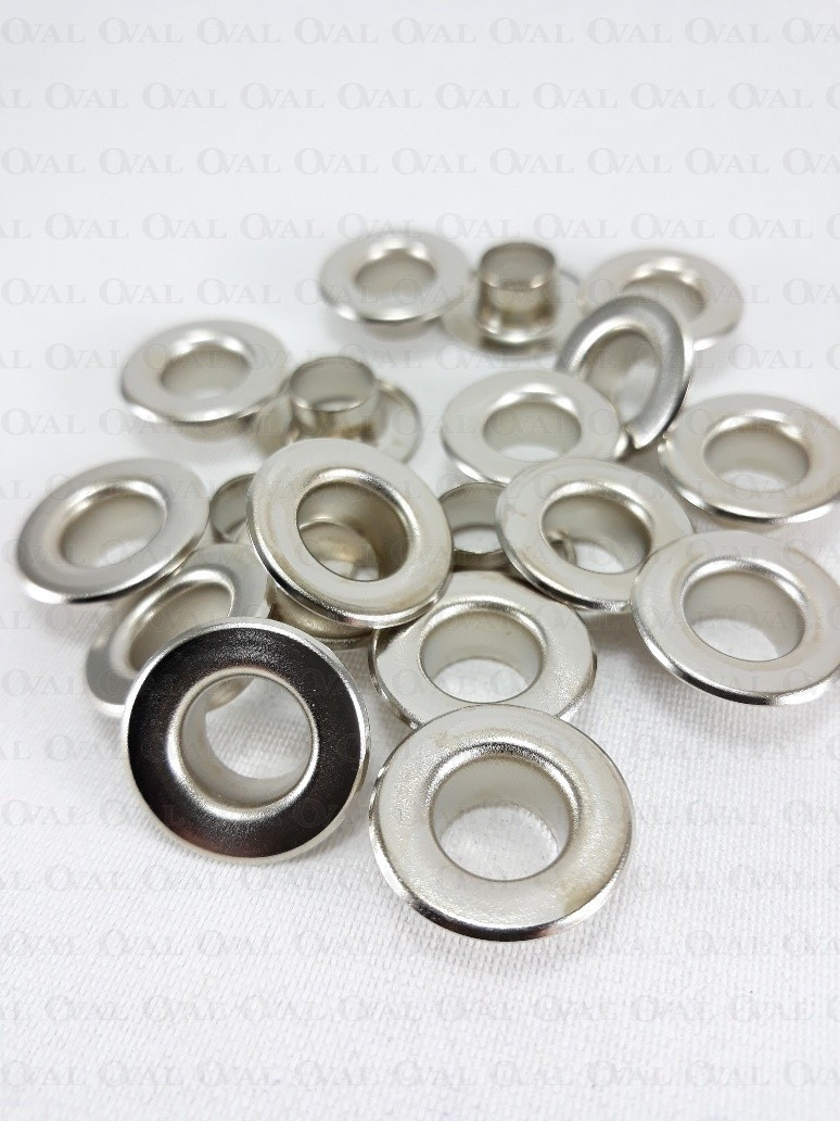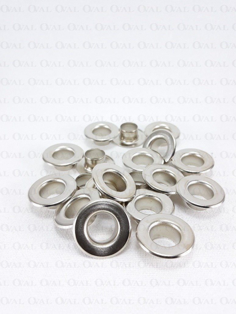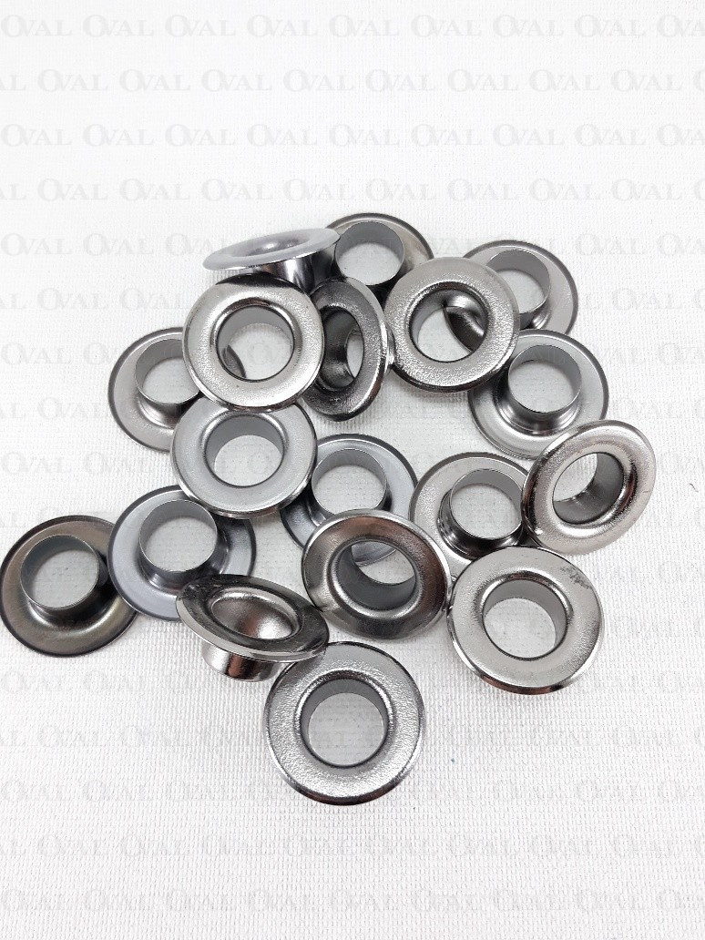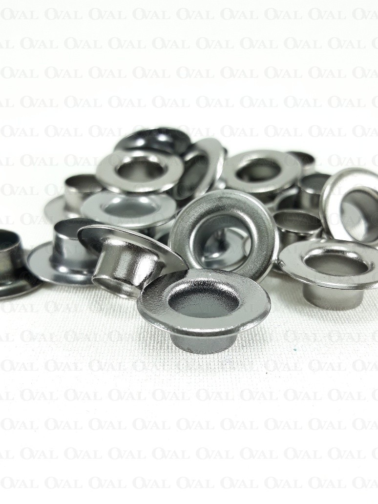 Flat tall metal eyelets for thicker fabrics and knits.