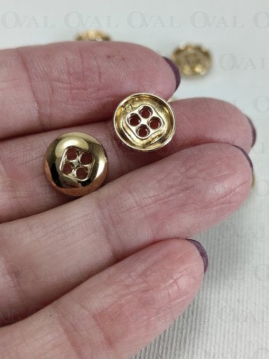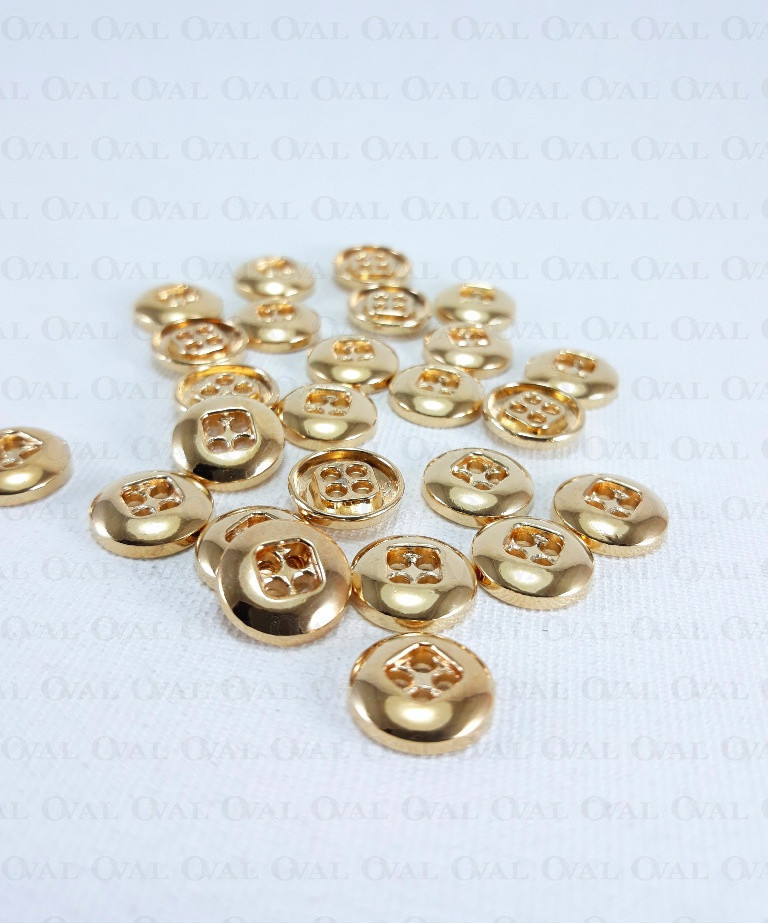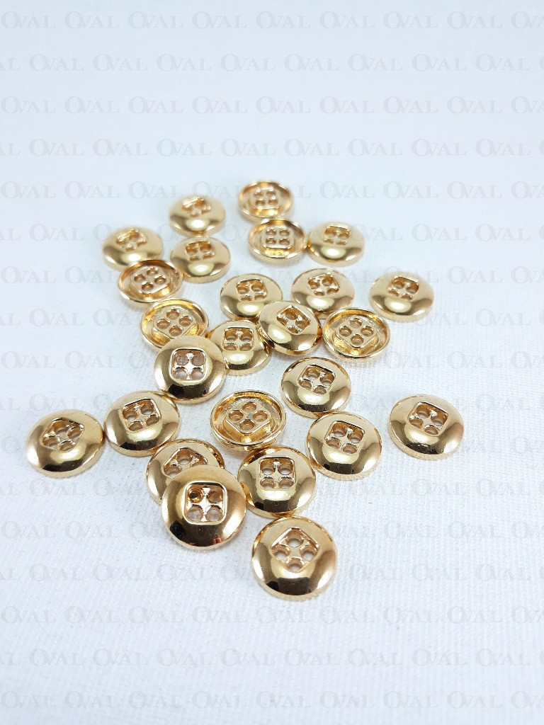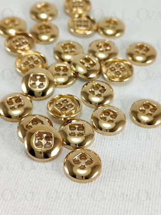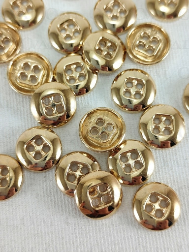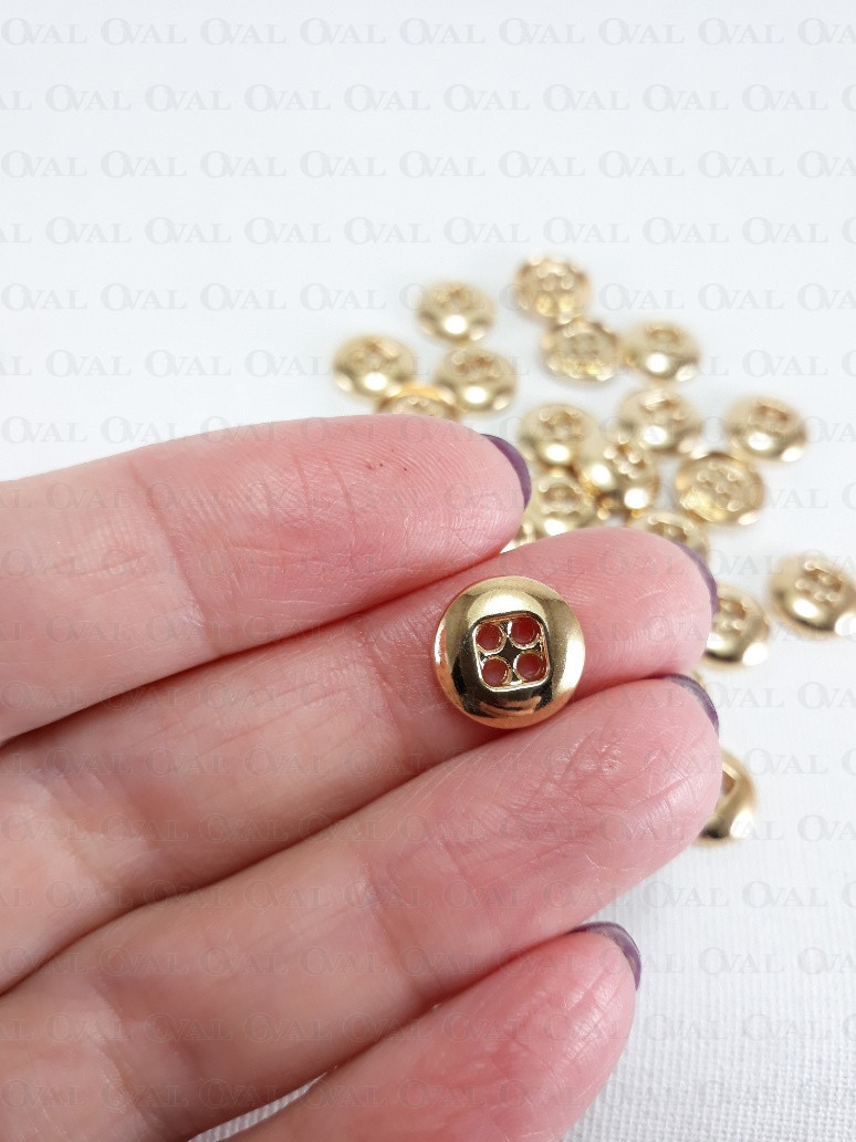 Metal button in gold colour, polished, with four holes.