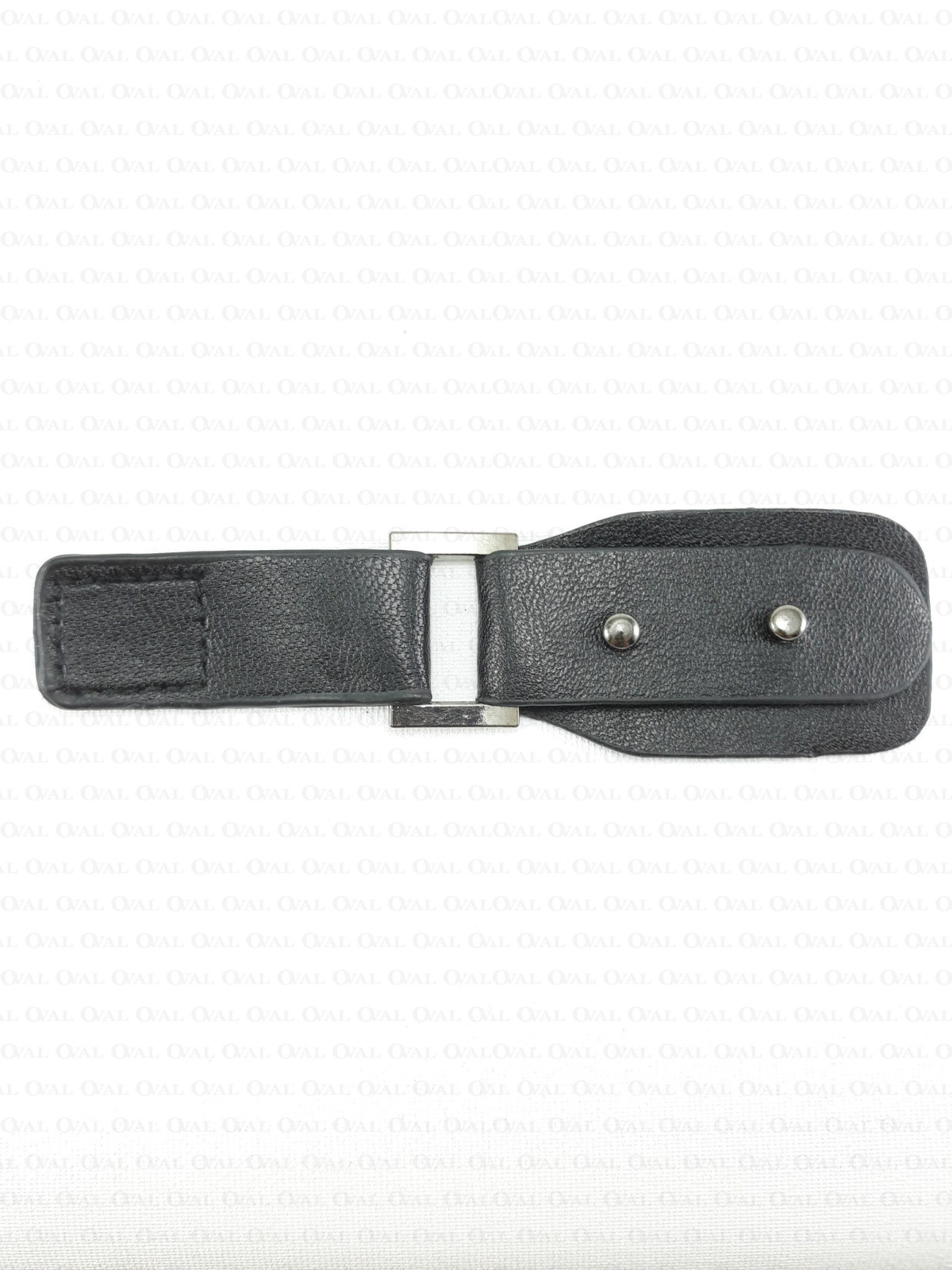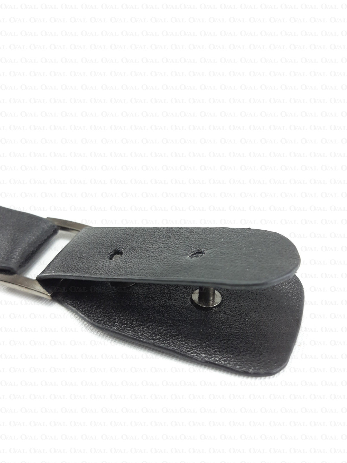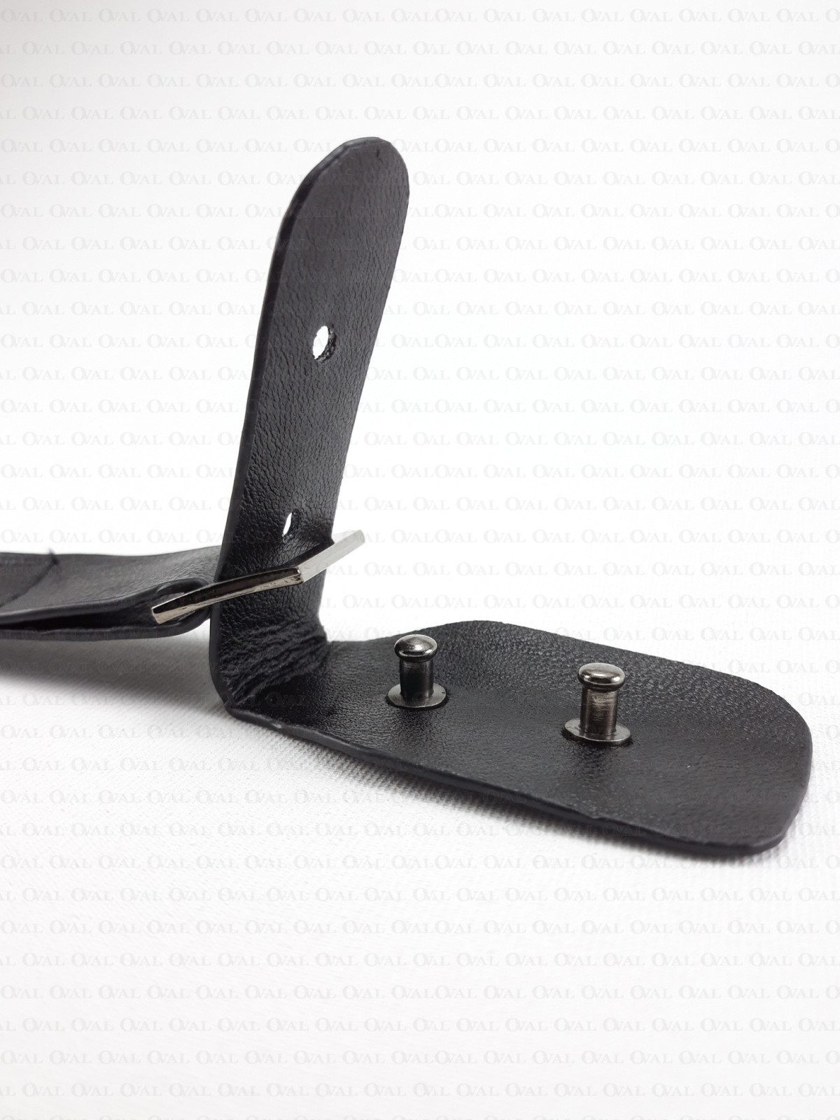 Leather fastening with a flap fastened with metal pins.