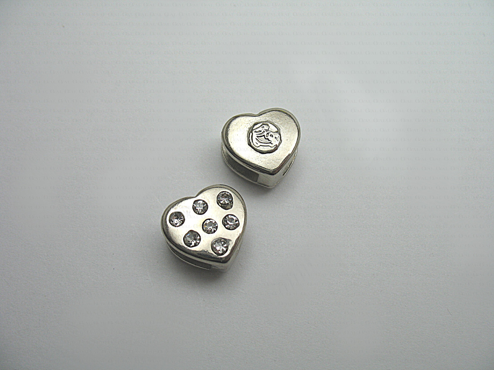 Metal, silver heart-shaped slider with rhinestones.