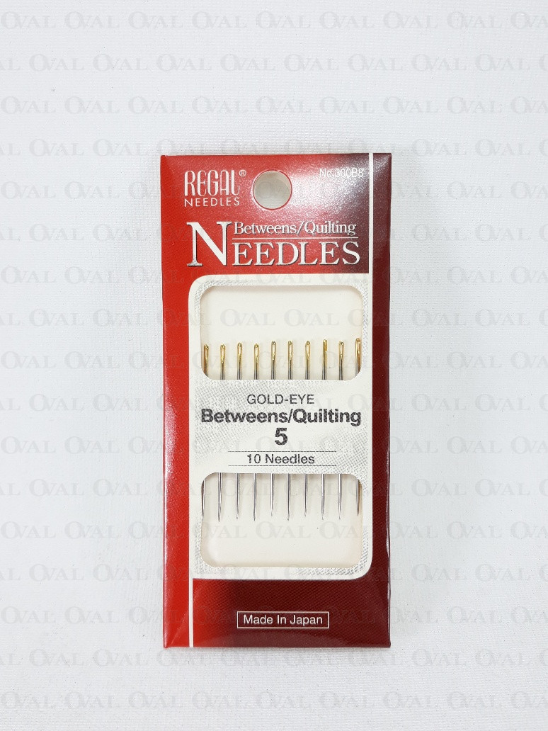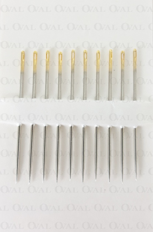 Card of 10 sewing needles with an elliptical gold-plated eye (length 34 mm).