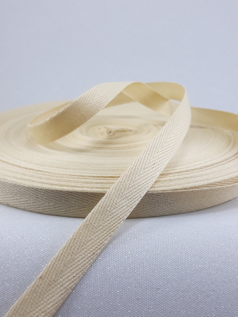Taśma bawełniana jodełka to wysokiej jakości, naturalna taśma introligatorska i krawiecka, idealna do szycia, wykończeń oraz tworzenia akcesoriów handmade. Wykonana w 100% z mocnej bawełny, zapewnia dużą wytrzymałość na rozciąganie i ścieranie, a charakterystyczny splot „jodełka” nadaje jej estetyczny, elegancki wygląd.