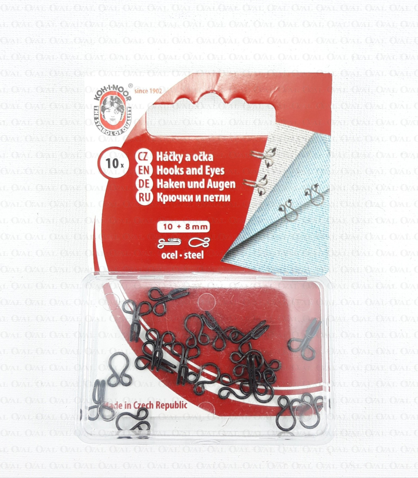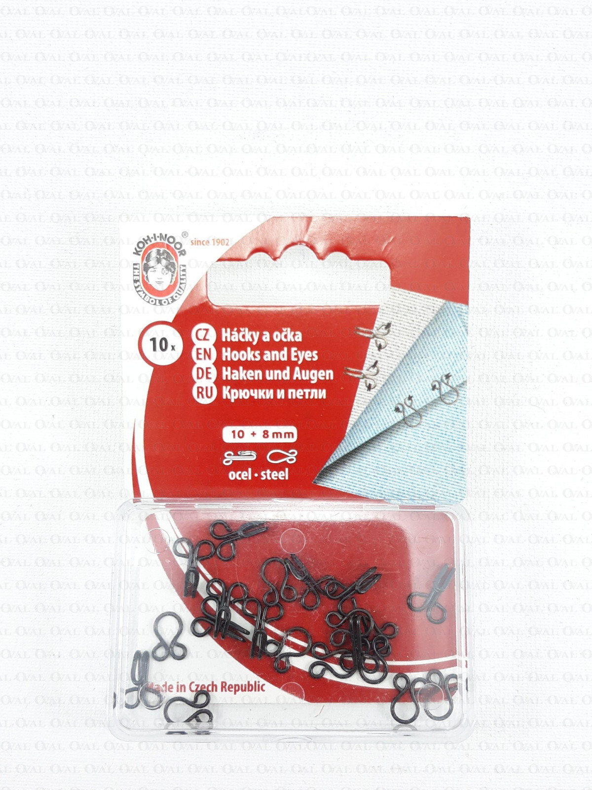 The set contains 10 pairs of black metal hooks and eyes (lacquered).