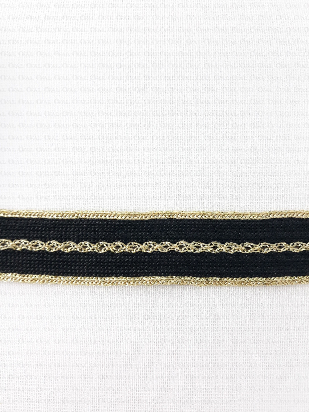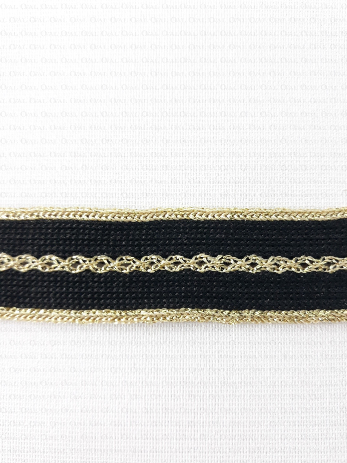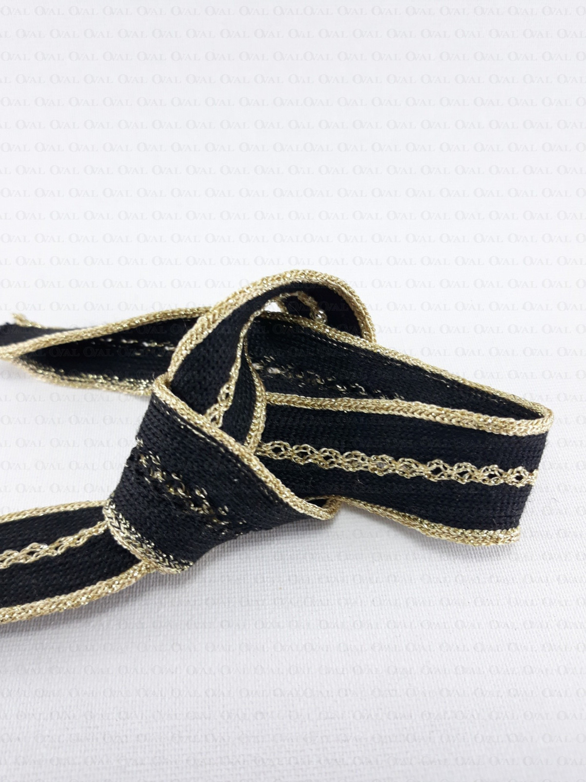 Decorative knitted tape with golden edges and openwork embroidery in the middle.