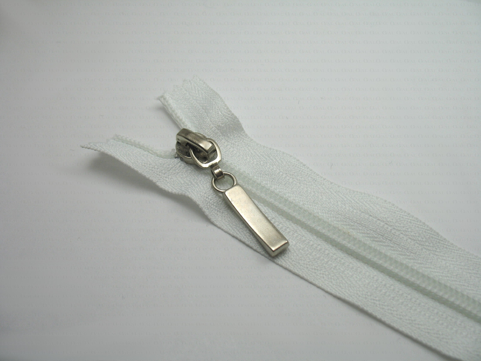 Zip with decorative silver tip in white.