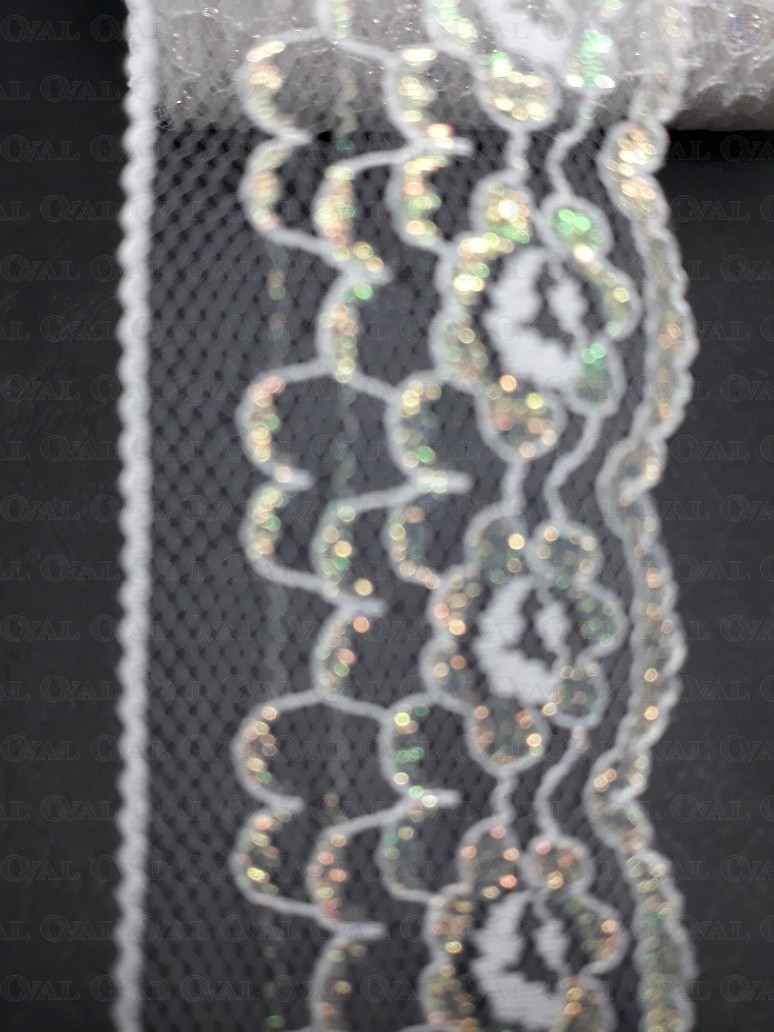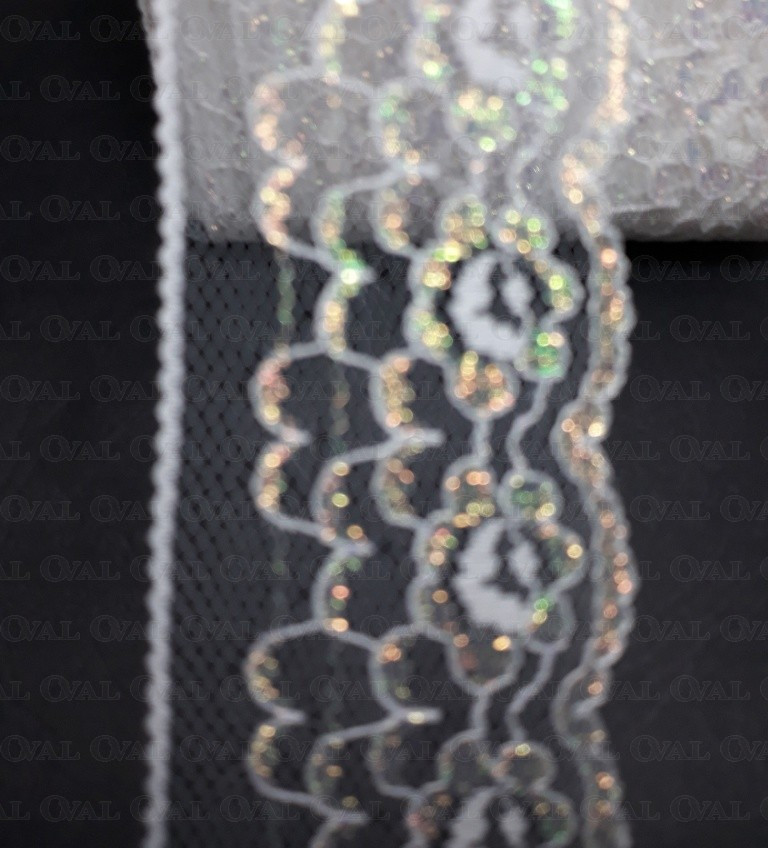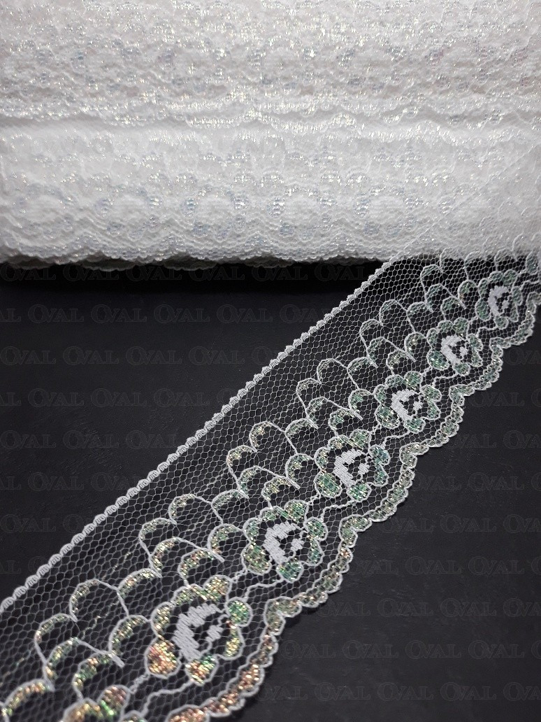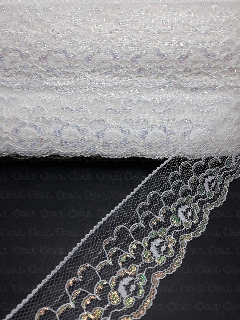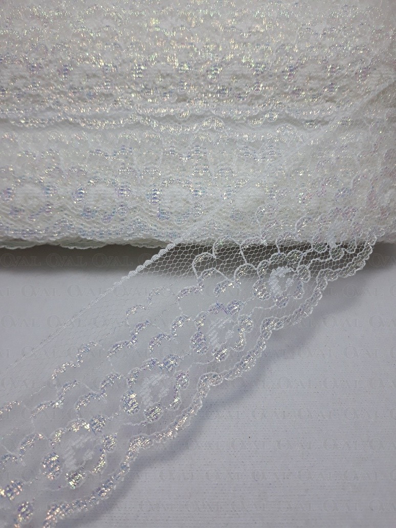 White nylon lace with iridescent reflections.