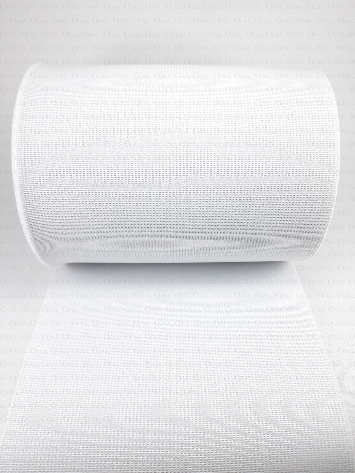 Woven elastic, 150 mm wide, very stretchable, stiff.