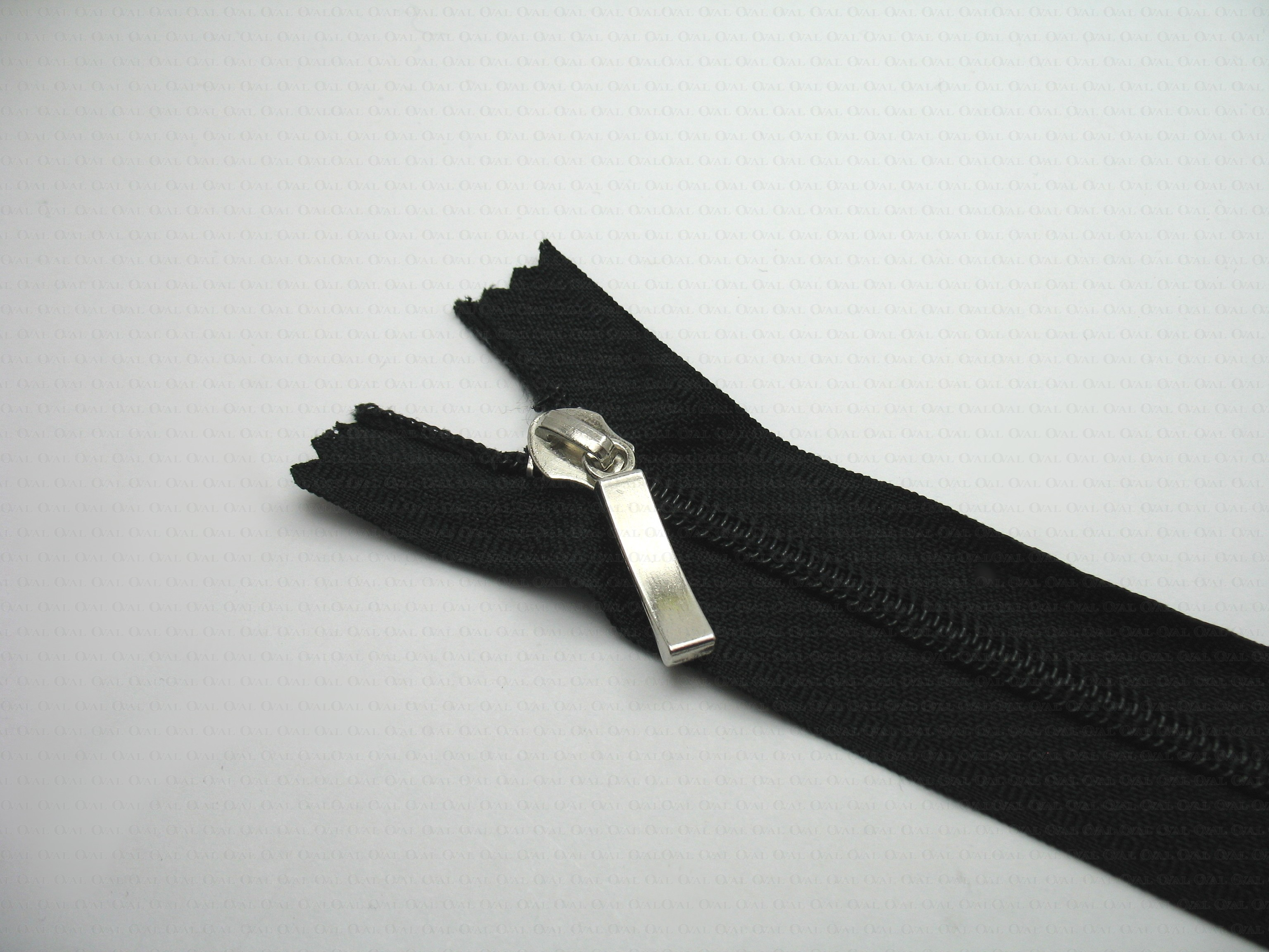 Zamek błyskawiczny w kolorze czarnym z metalową zawieszką w kolorze srebrnym.
