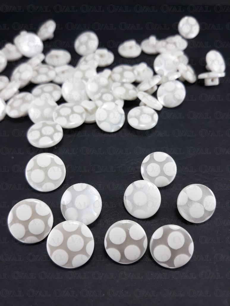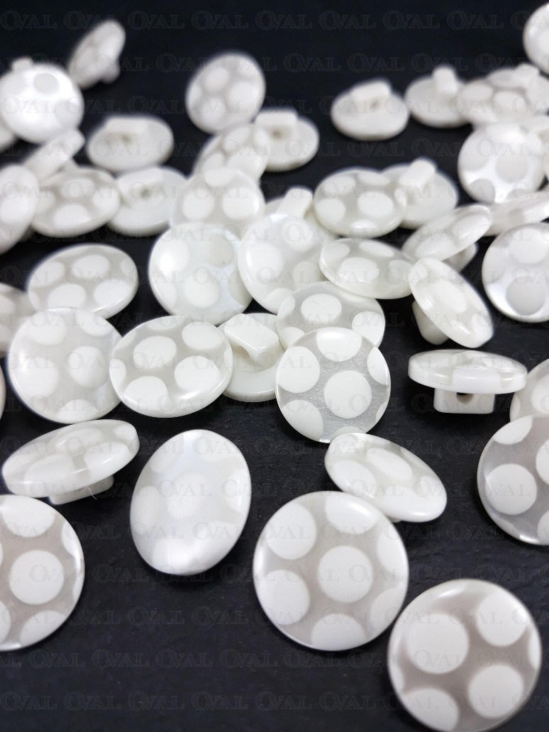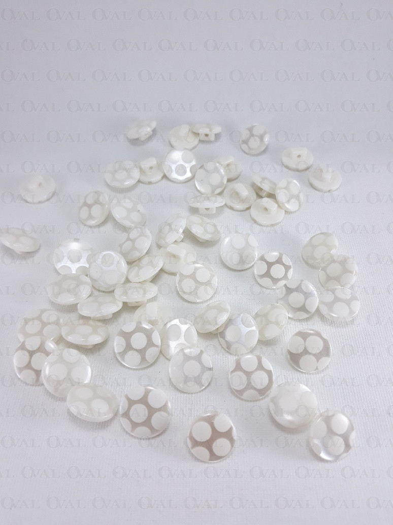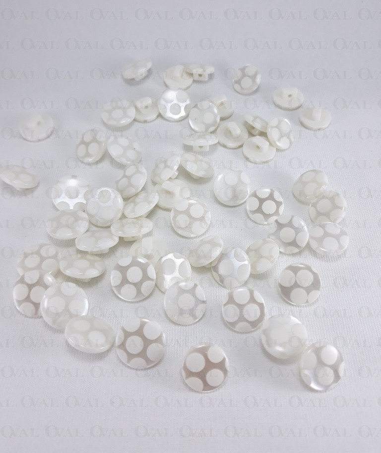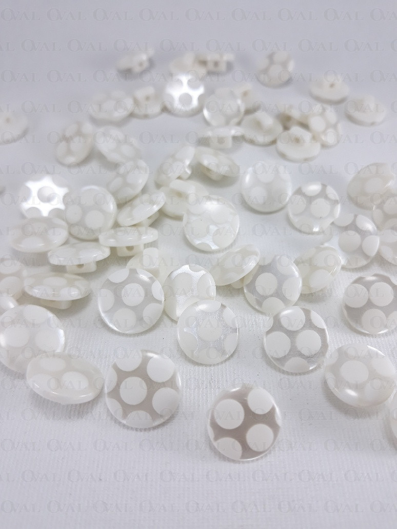 Guziki poliestrowe ,perłowe na białym spodzie z białymi kropeczkami.