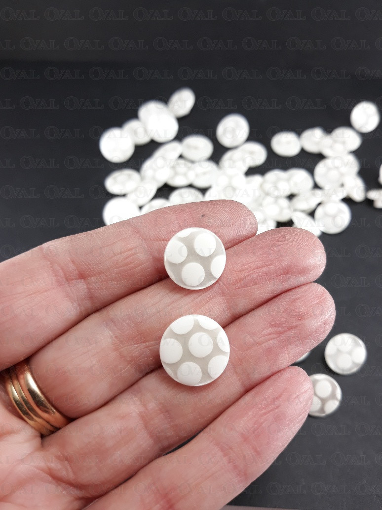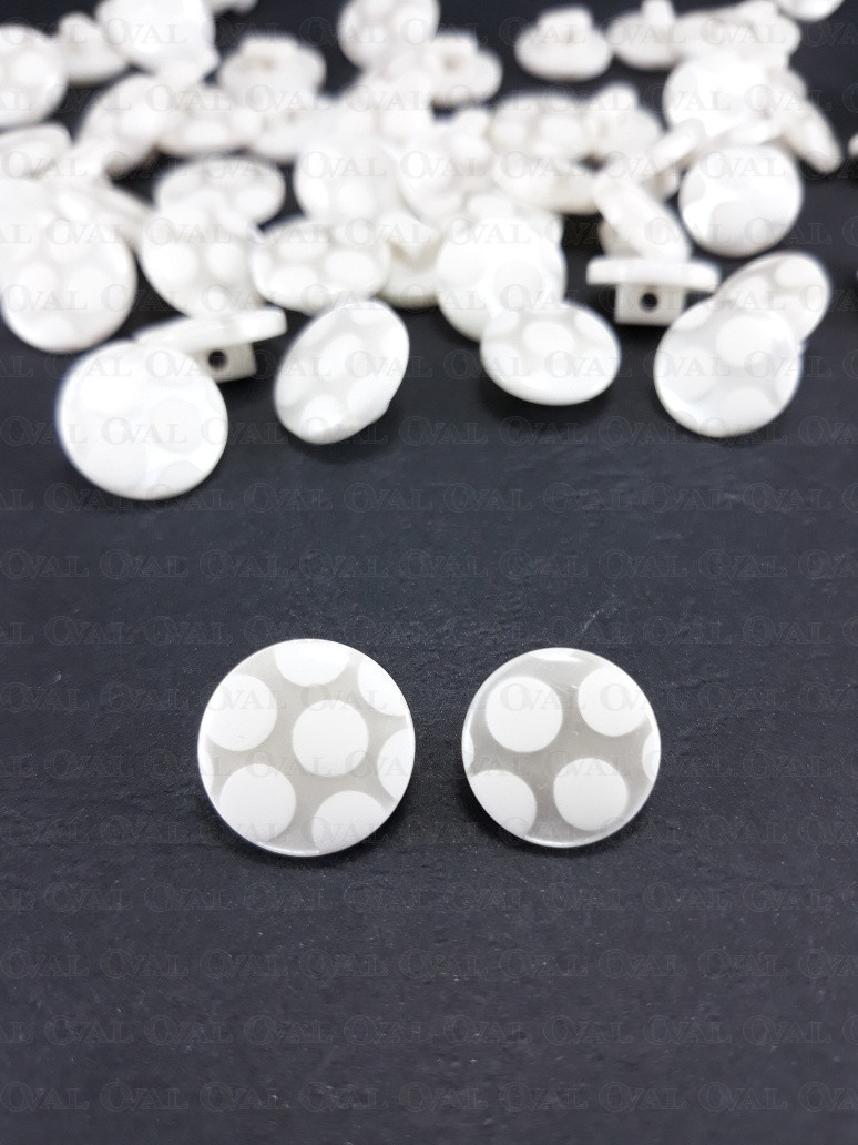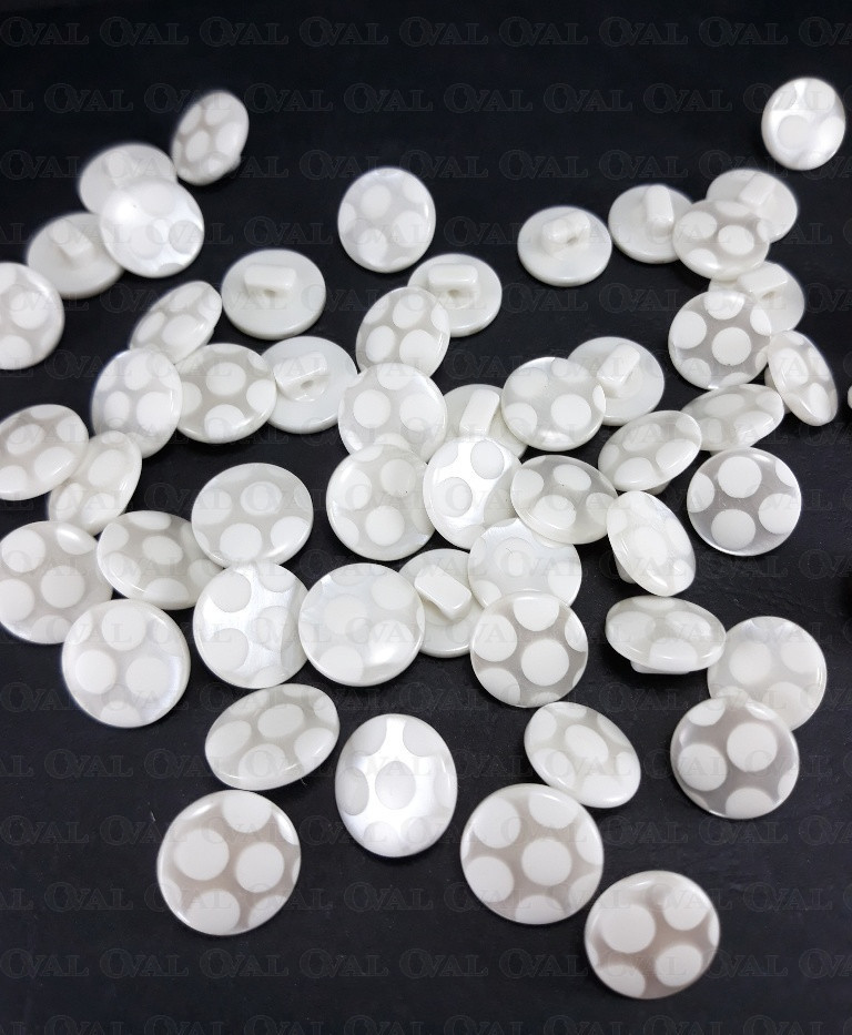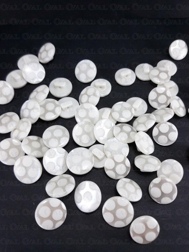 Guziki poliestrowe ,perłowe na białym spodzie z białymi kropeczkami.