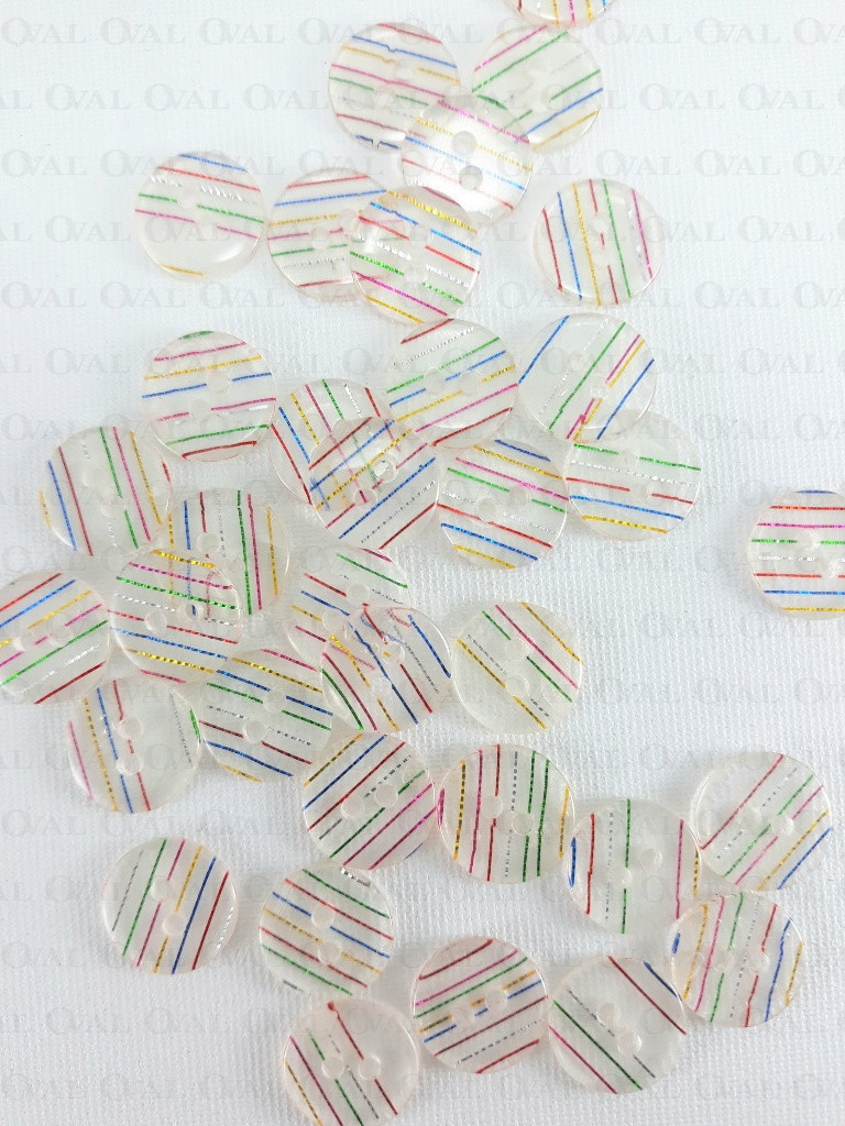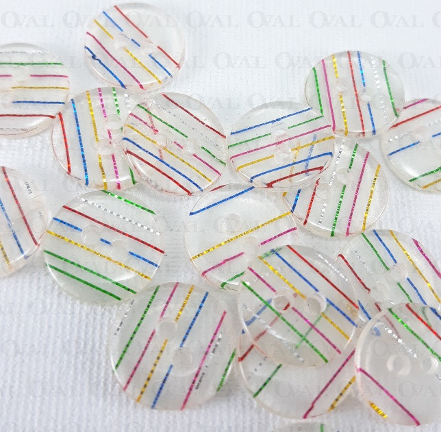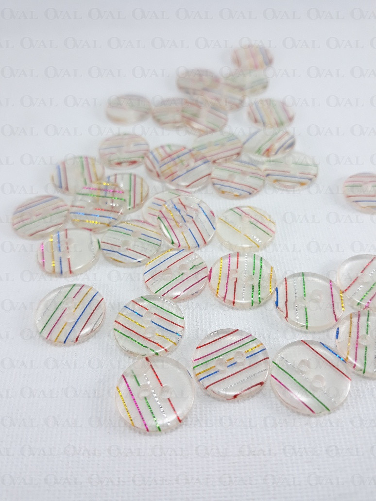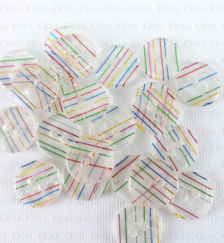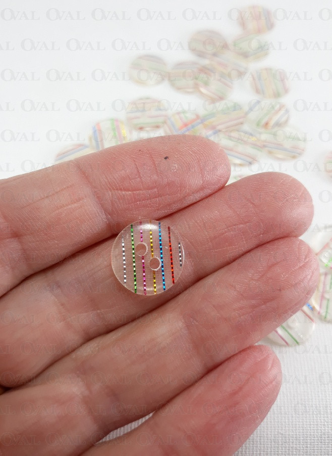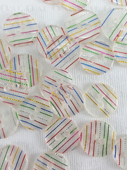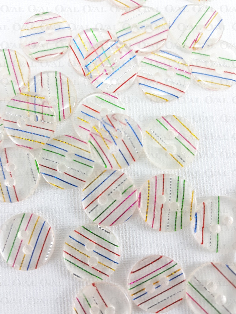 Poliestrowe guziki na dziurki , przeźroczyste z kolorowymi, błyszczącymi paseczkami zatopionymi w środku.