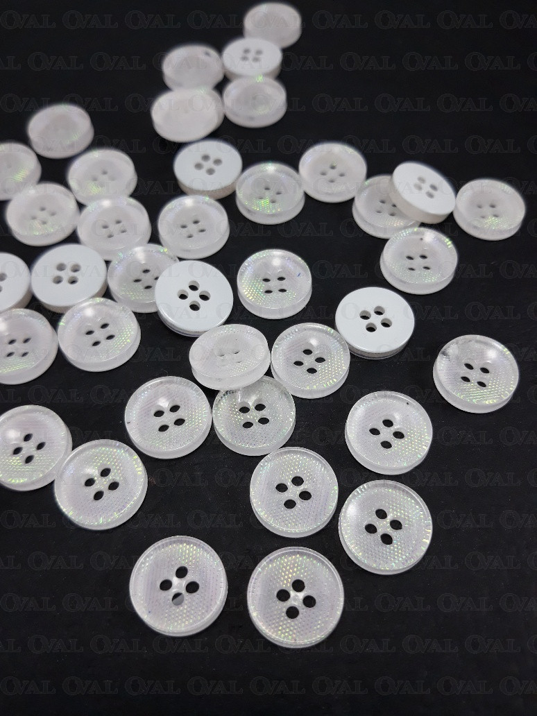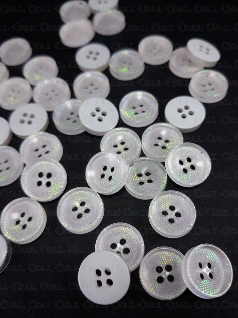 Guzik poliestrowy, z białym spodem opalizujący.