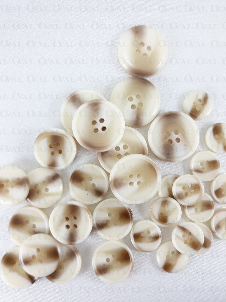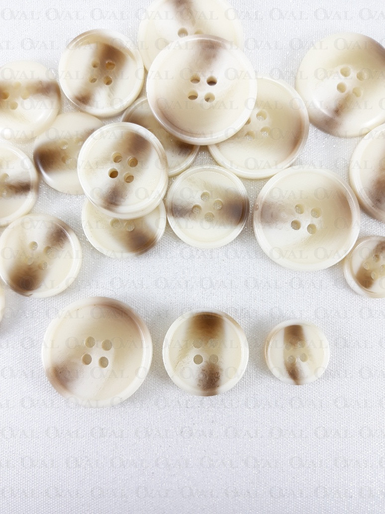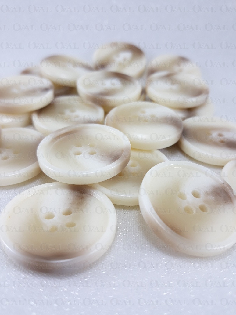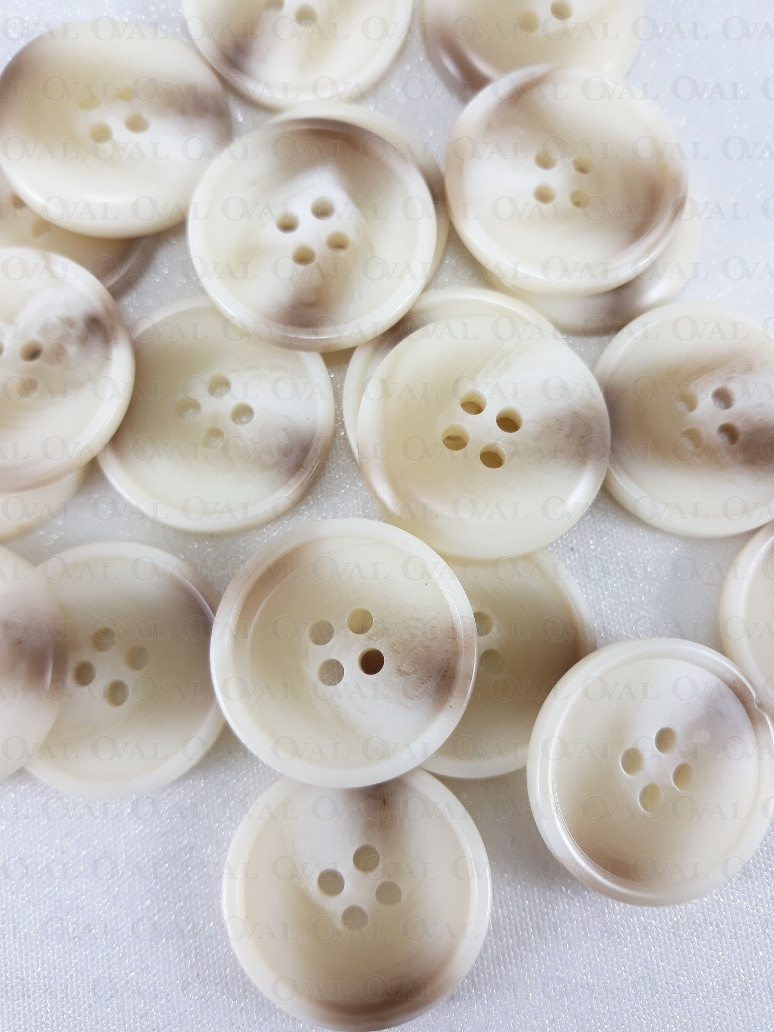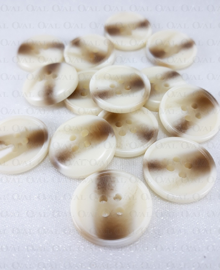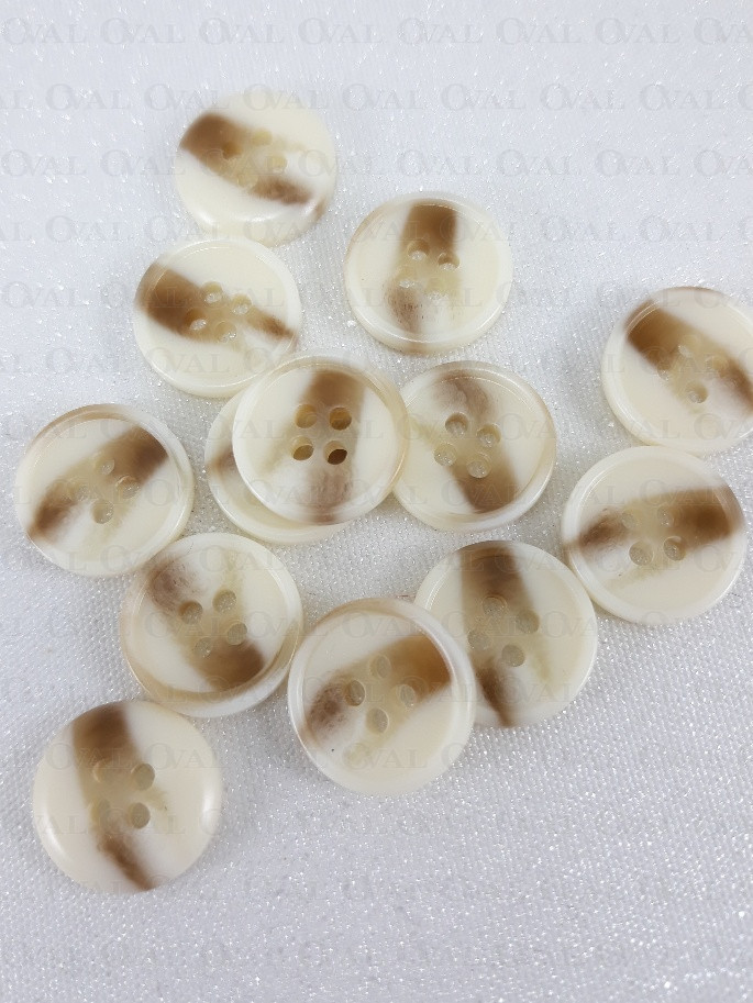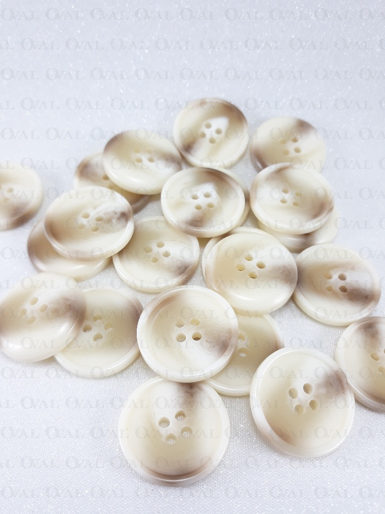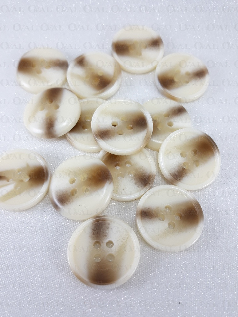 Guzik czterodziurkowy w odcieniach beżu z brązem.