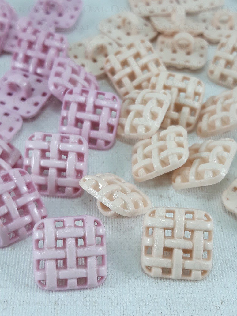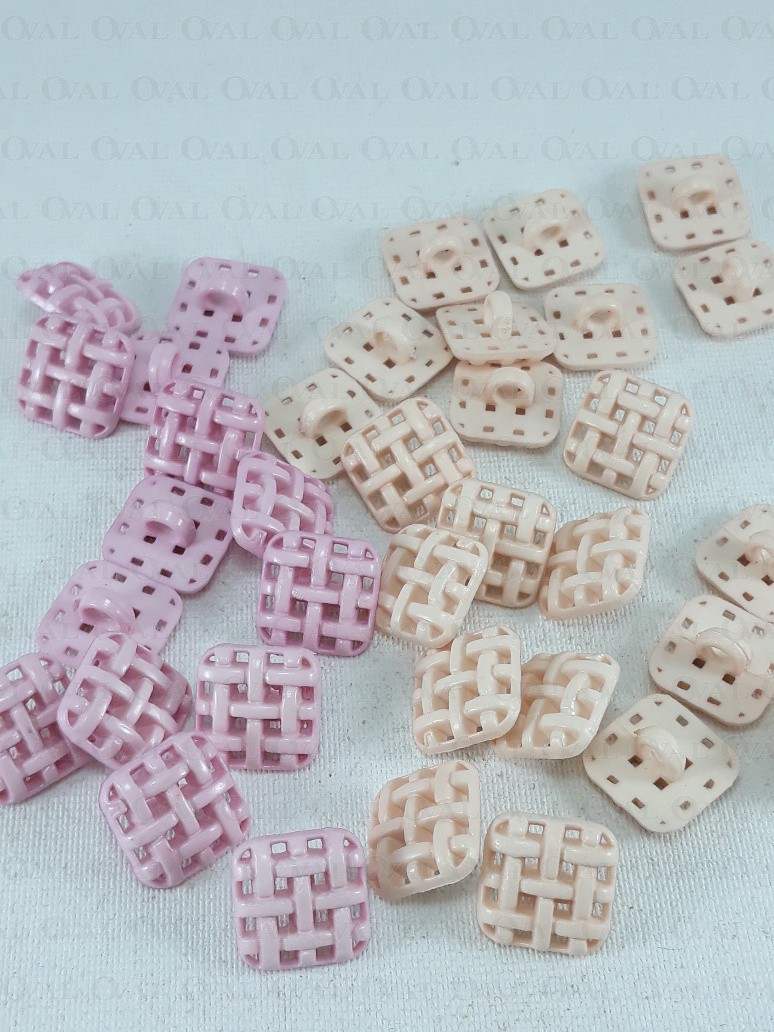Guzik plastikowy na stopce w formie ażurowej krateczki.