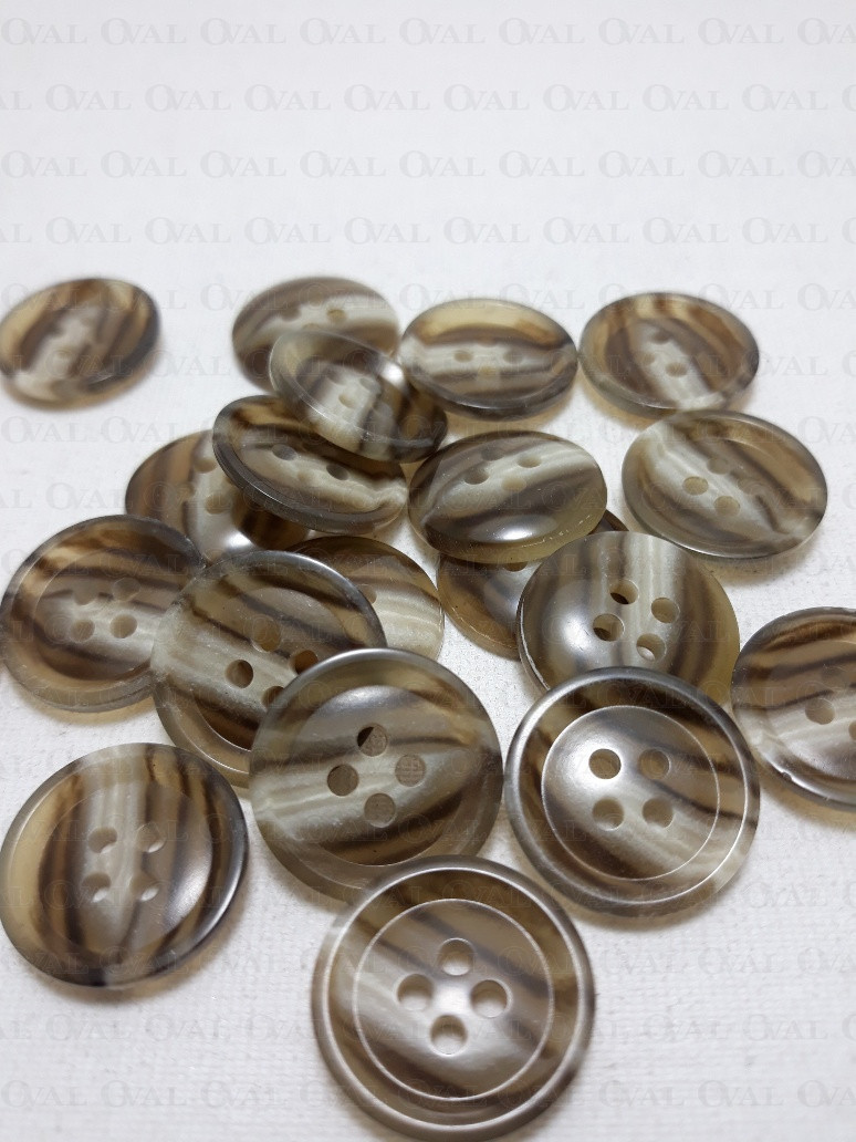 Guzik czterodziurkowy w odcieniach beżu z brązem.