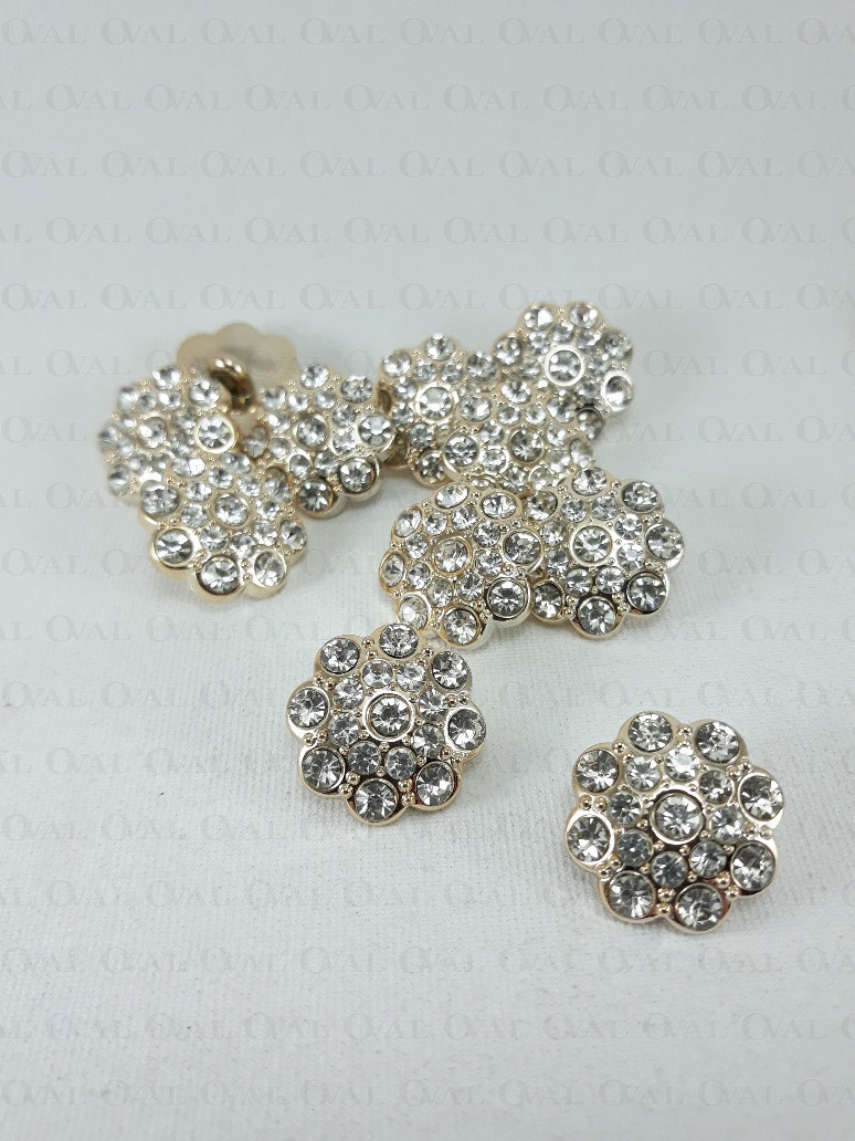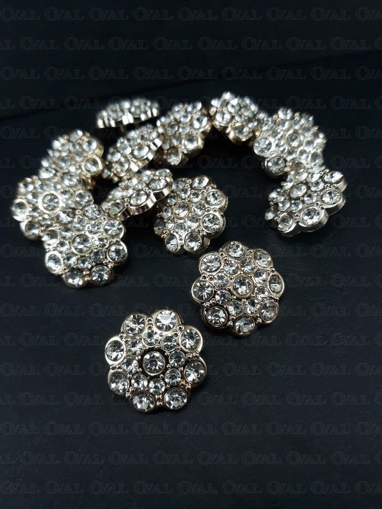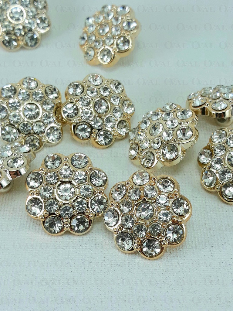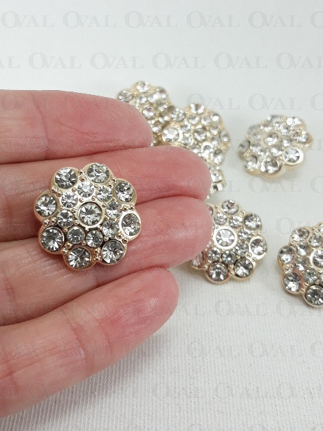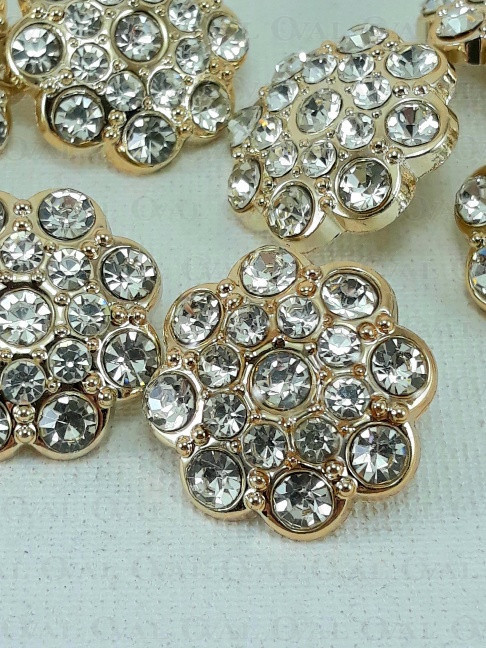 Guzik poliestrowy, metalizowany, na stopce, z akrylowym kamieniem.