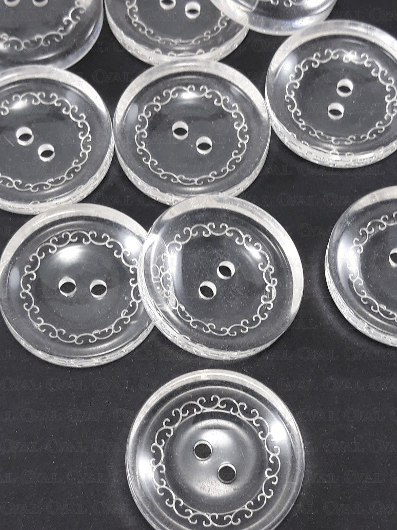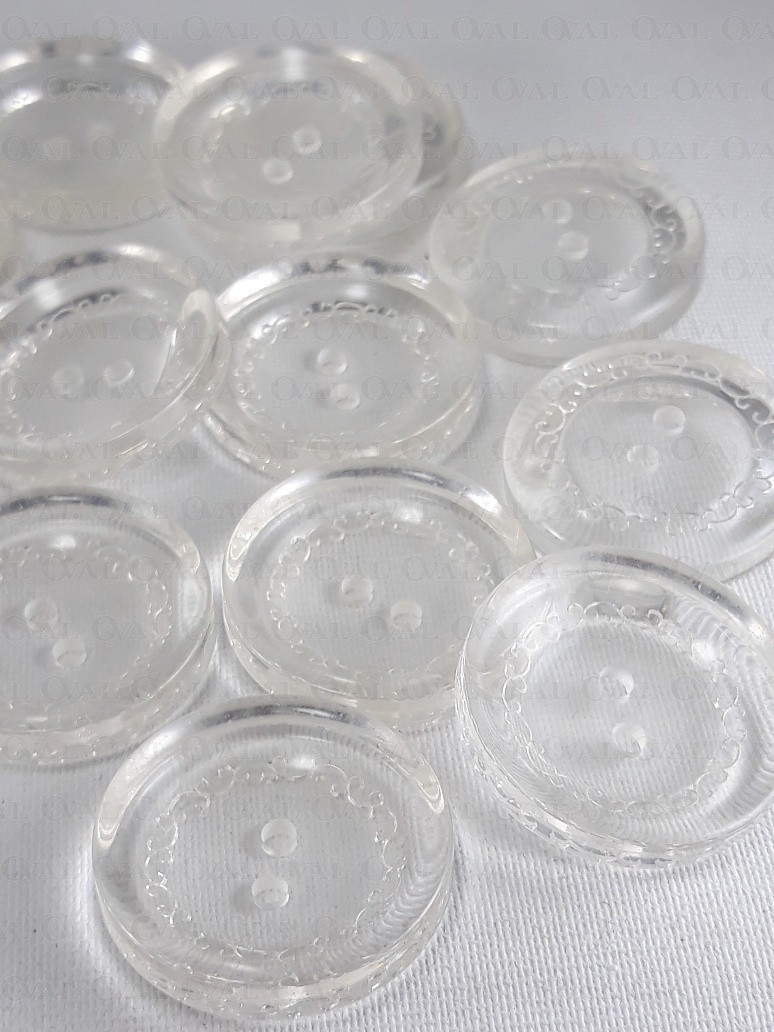 Guzik plastikowy , przeźroczysty z wyżłobionym wzorem od spodu.