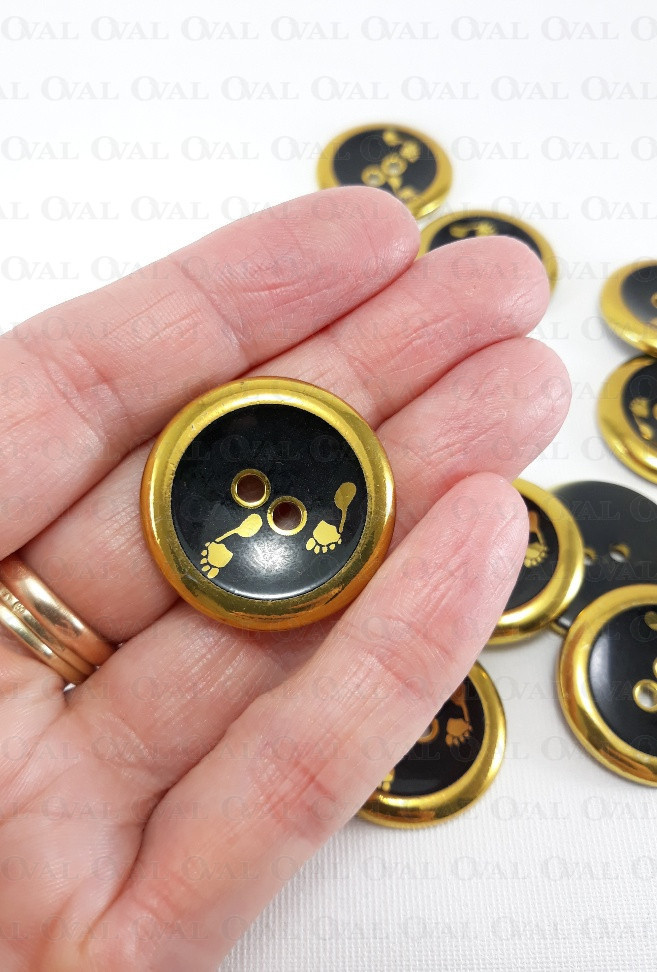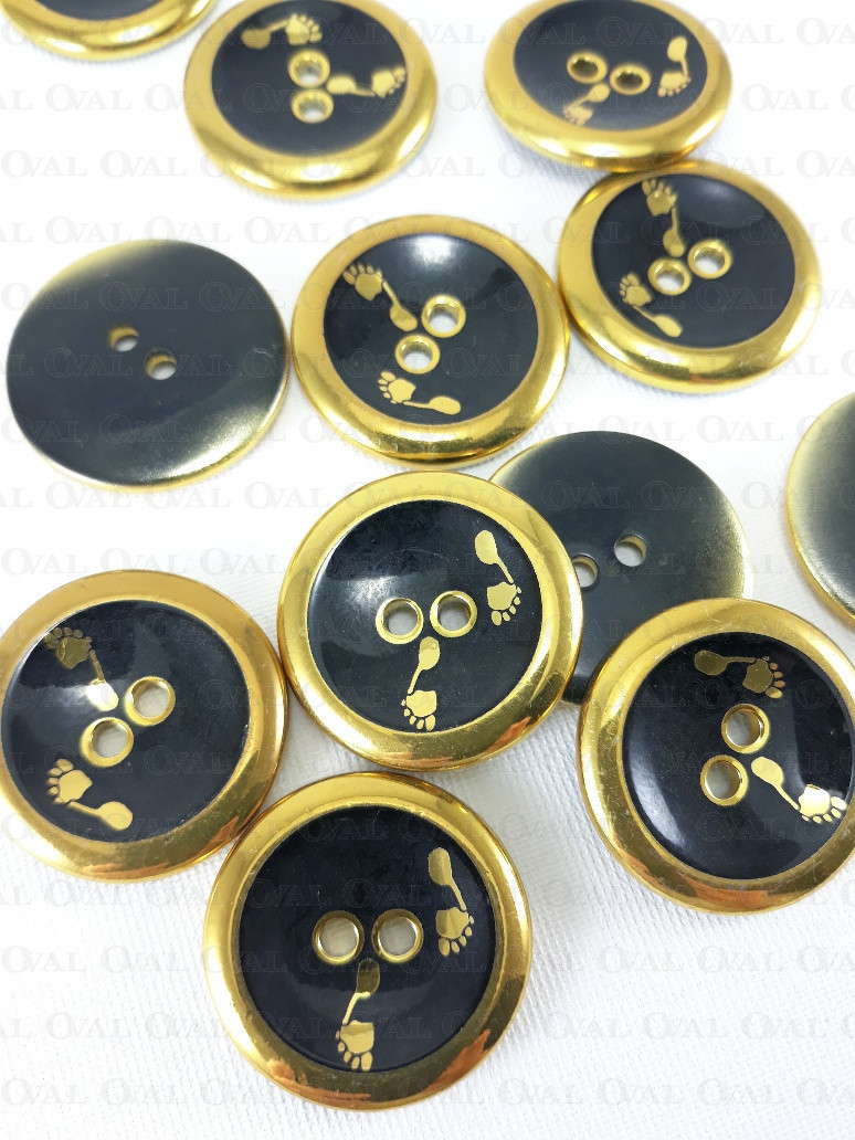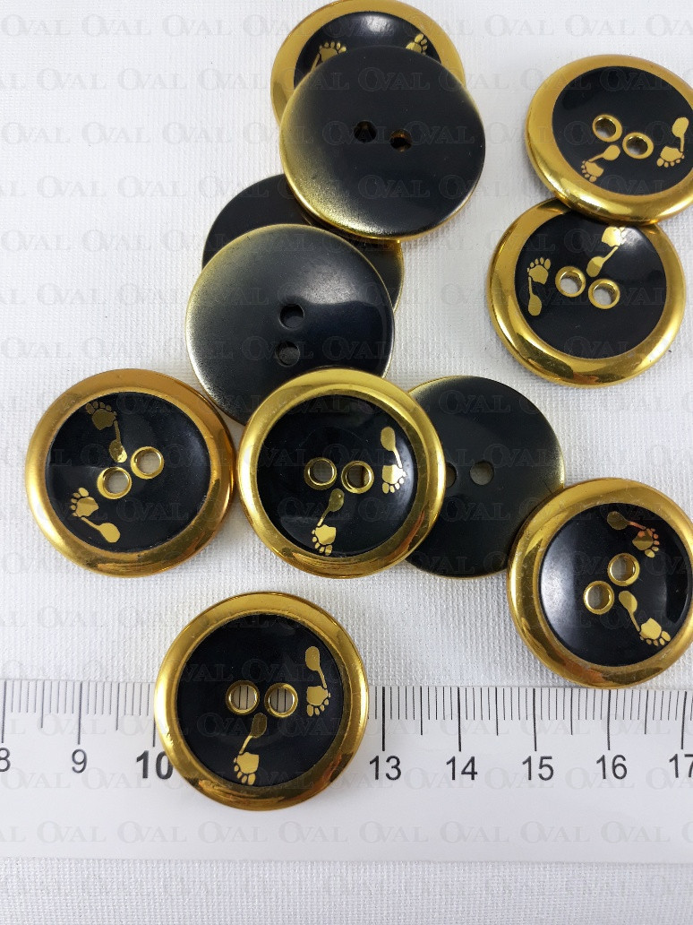 Guzik plastikowy ze złotą obwódka i nadrukiem stóp
