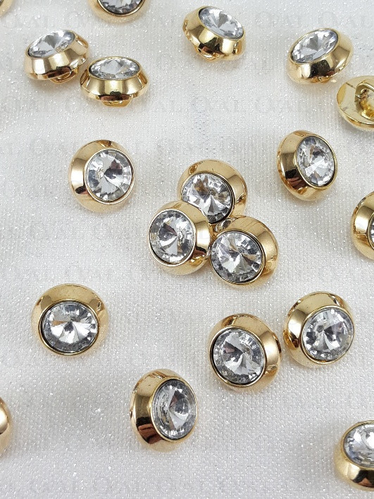 Guzik plastikowy metalizowany, na stopce, z akrylowym kamieniem.