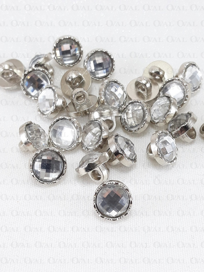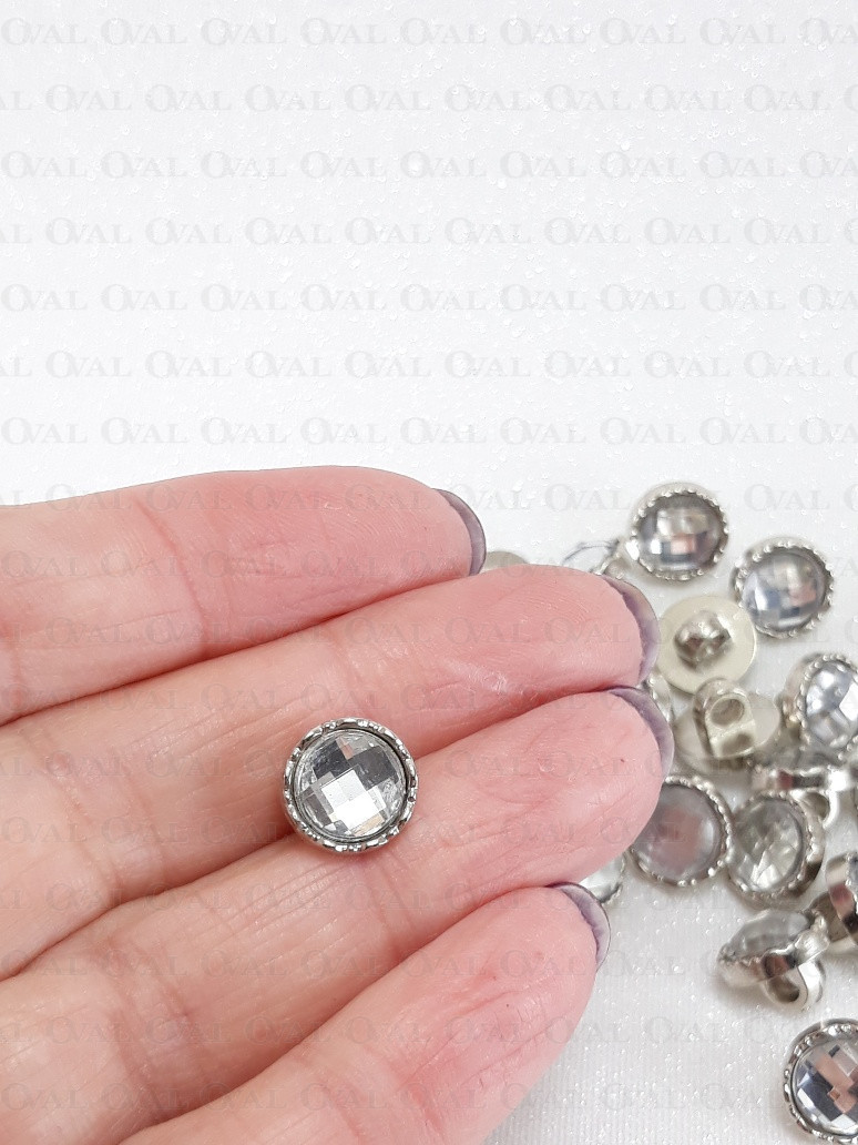 Guzik poliestrowy, metalizowany, na stopce, z akrylowym kamieniem.