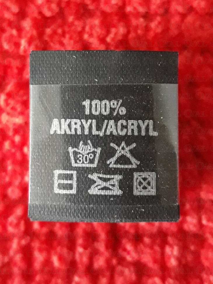 Wszywka odzieżowa zawierająca skład surowcowy o raz przepis prania uszytego produktu.