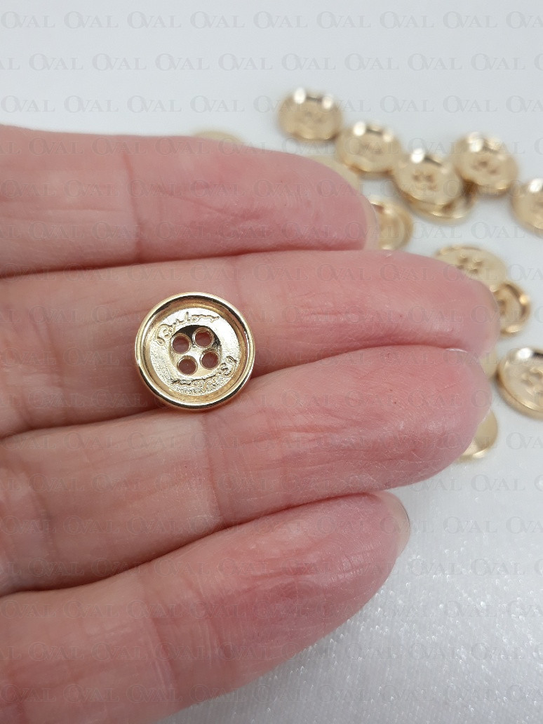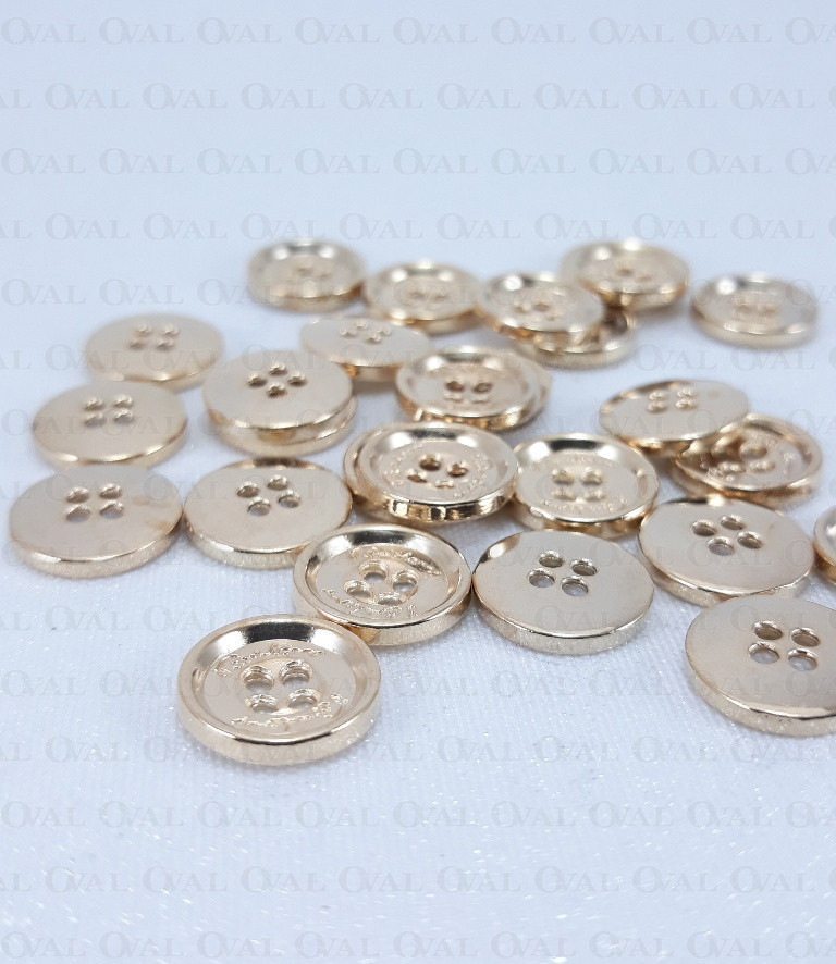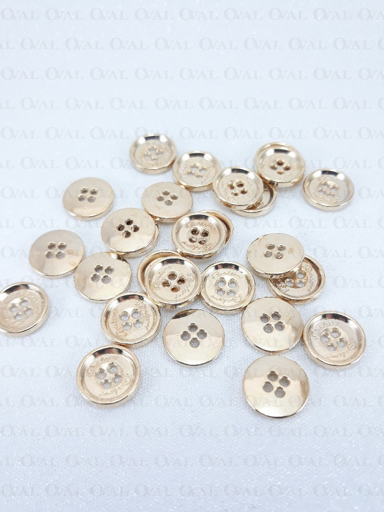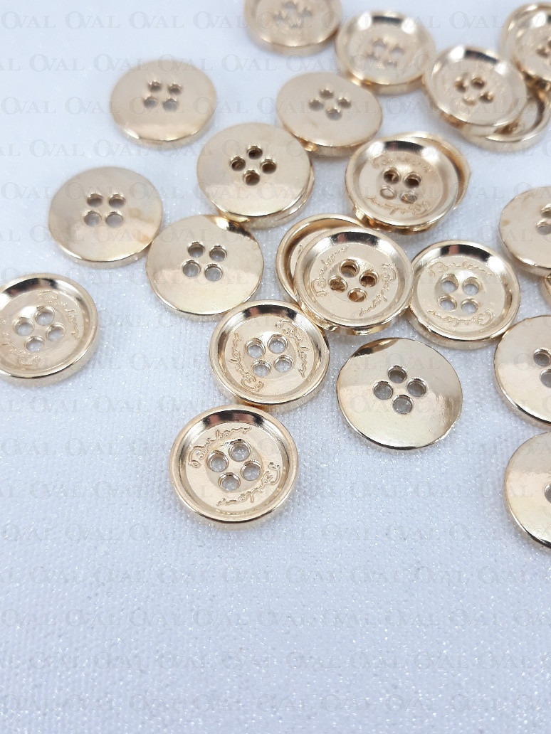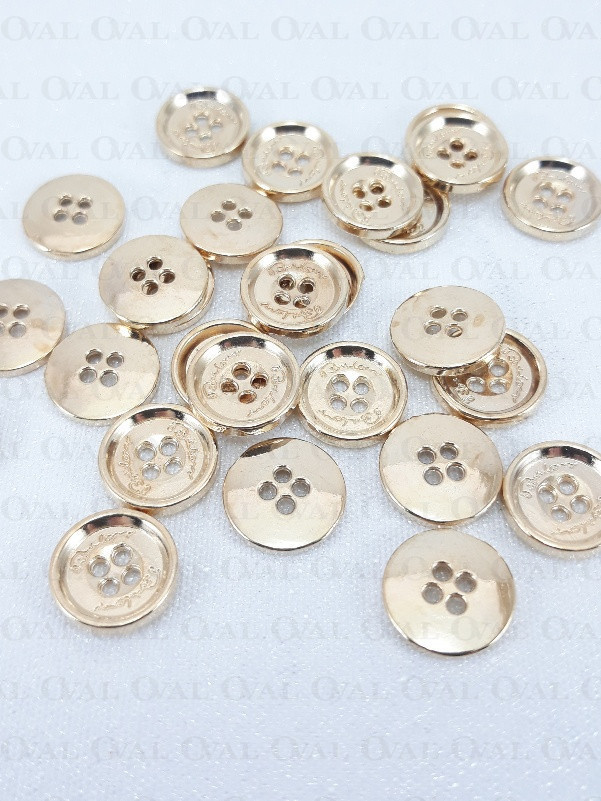 Metalowy guziki w kolorze złoty, wybłyszczany tył, na cztery dziurki.