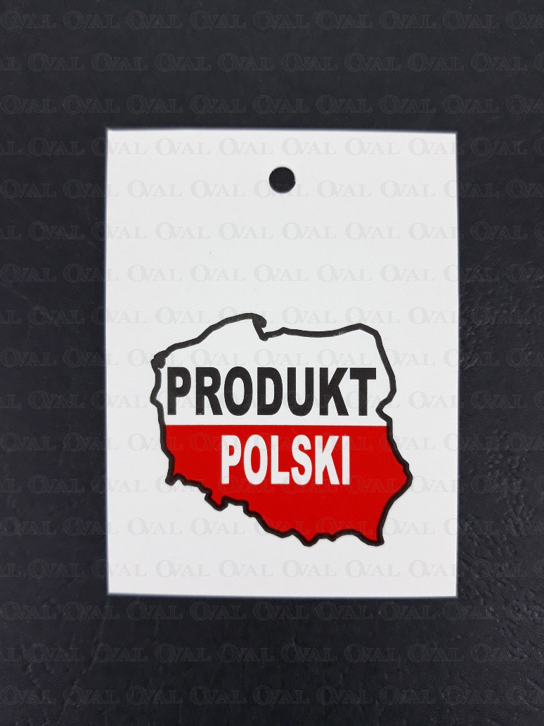 Papierowa etykieta "PRODUKT POLSKI" z dziurką do przewleczenia sznureczka