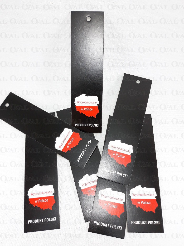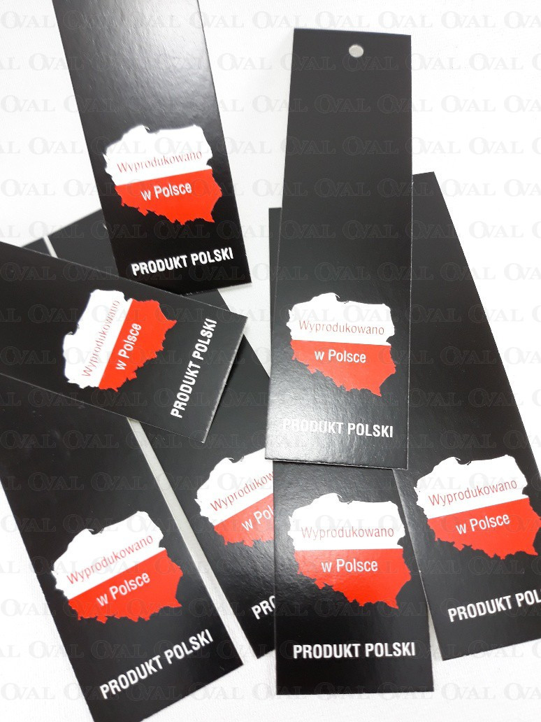 Papierowa etykieta "PRODUKT POLSKI" z dziurką do przewleczenia sznureczka