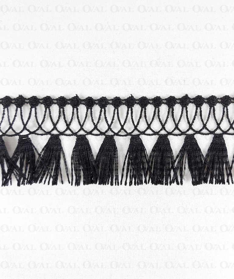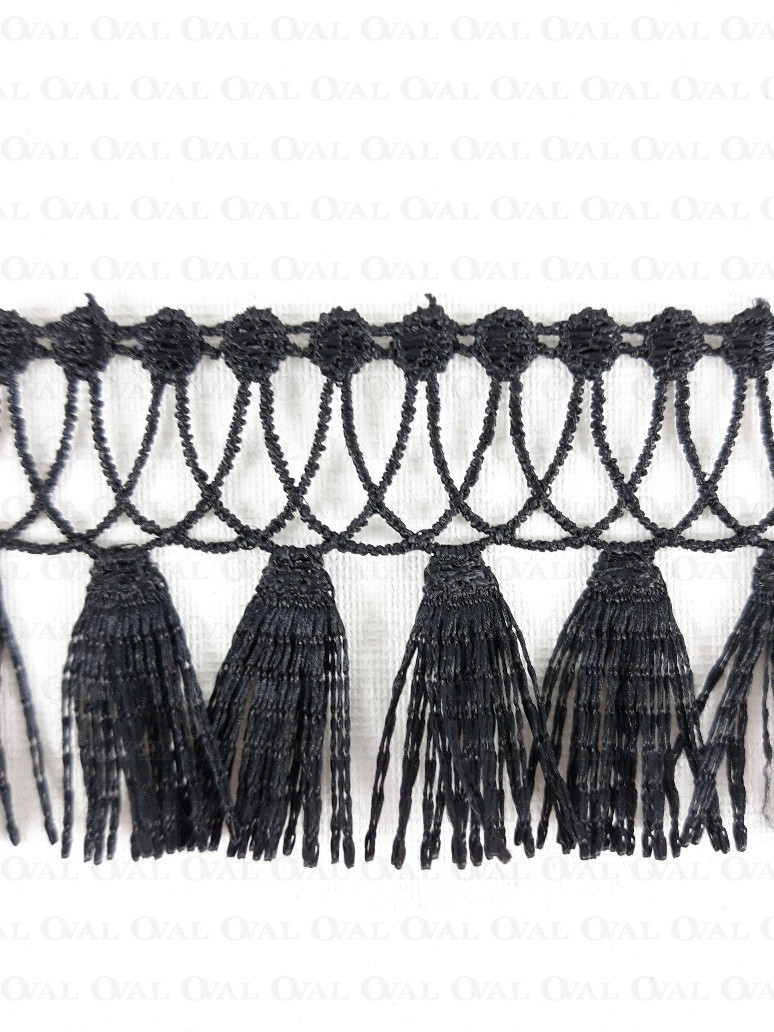 Koronka gipiurowa wykończona frędzelkami z delikatnym połyskiem.