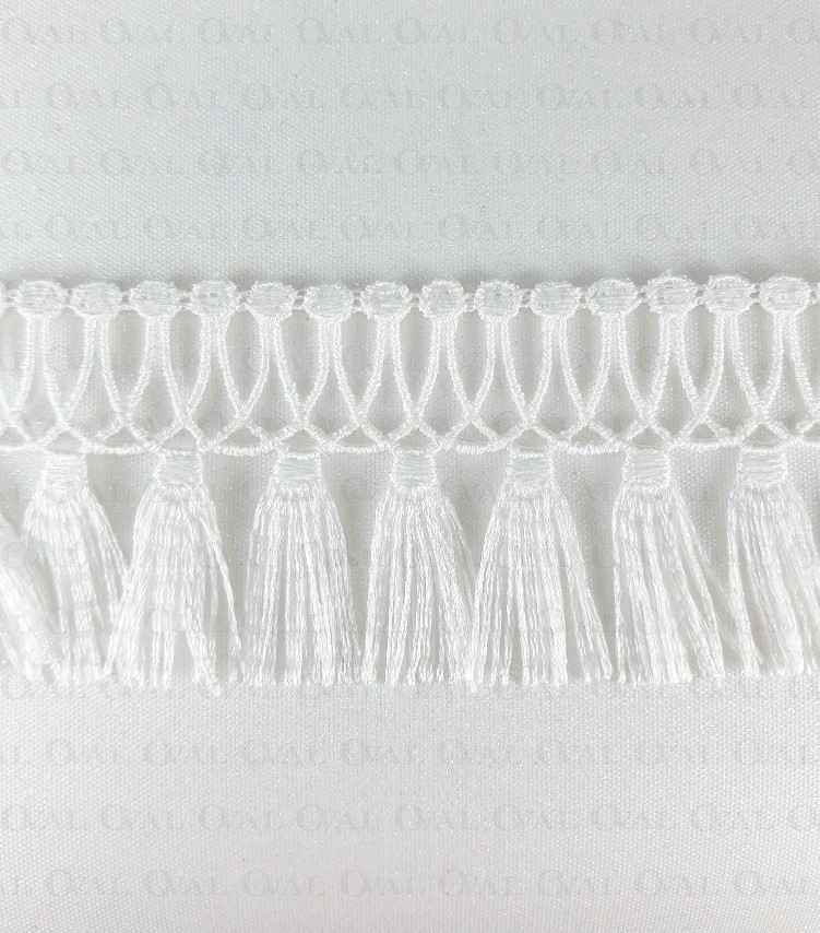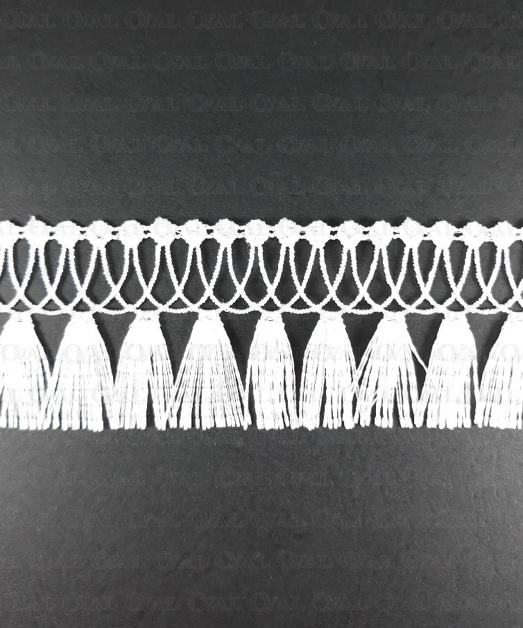 Koronka gipiurowa wykończona frędzelkami z delikatnym połyskiem.