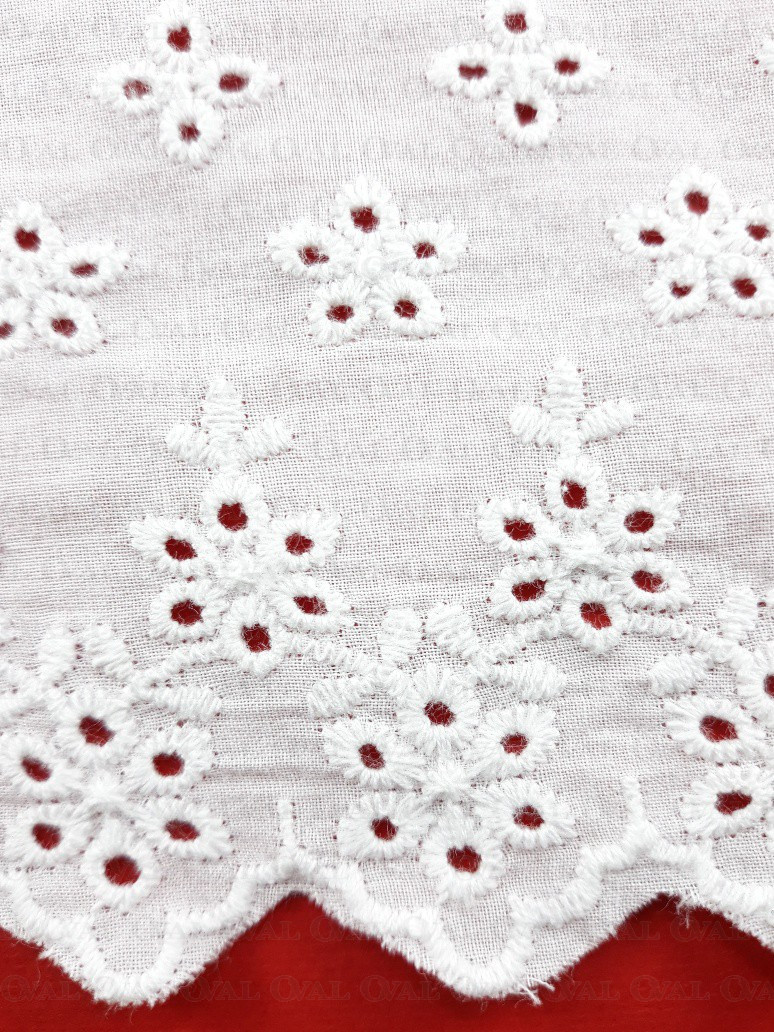 Koronka bardzo dobrej jakości z ażurowym wzorem haftowana na bawełnie.